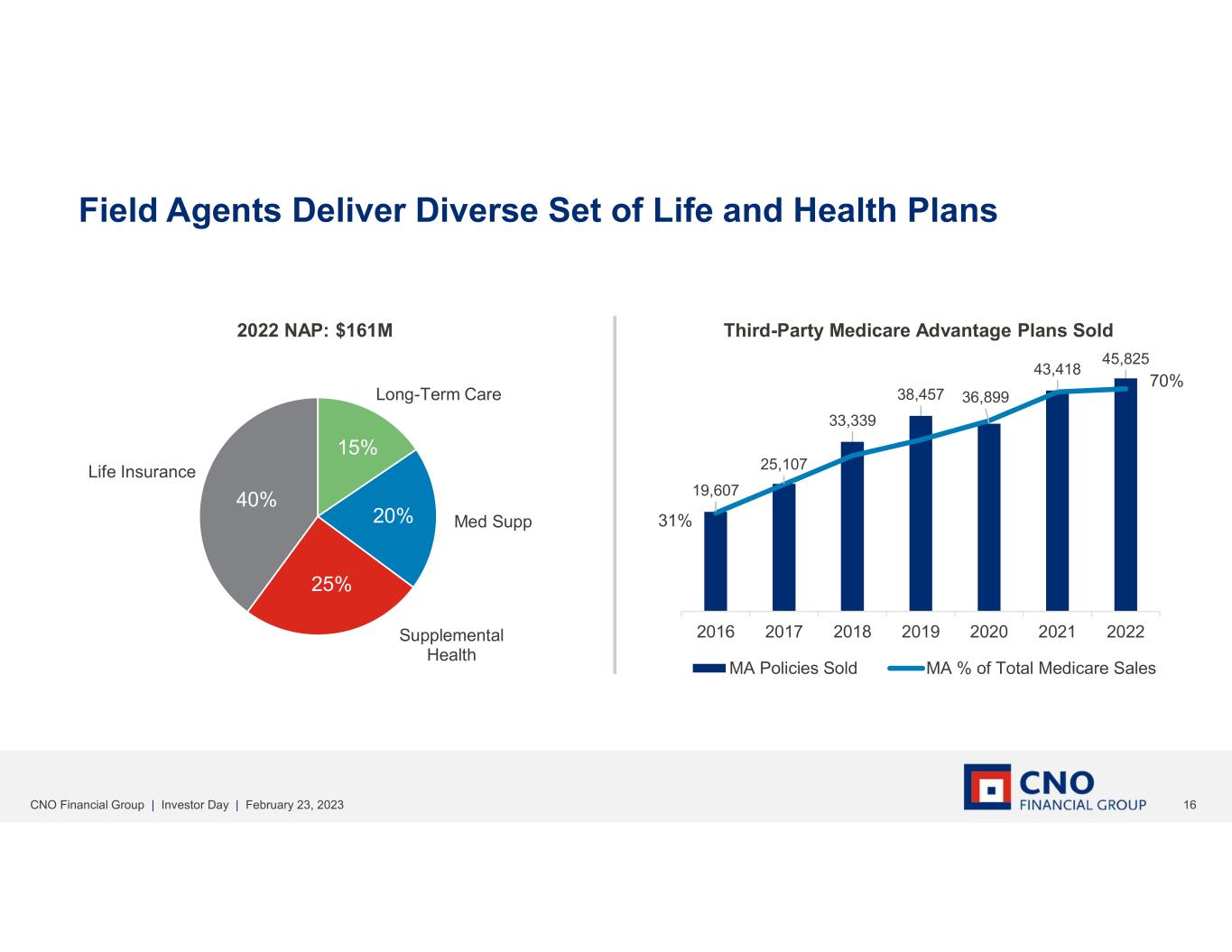 CNO Financial Group | Investor Day | February 23, 2023 16 Long-Term Care Med Supp Supplemental Health Life Insurance 19,607 25,107 33,339 38,457 36,899 43,418 45,825 31% 70% 2016 2017 2018 2019 2020 2021 2022 MA Policies Sold MA % of Total Medicare Sales Field Agents Deliver Diverse Set of Life and Health Plans 2022 NAP: $161M Third-Party Medicare Advantage Plans Sold 40% 15% 20% 25%