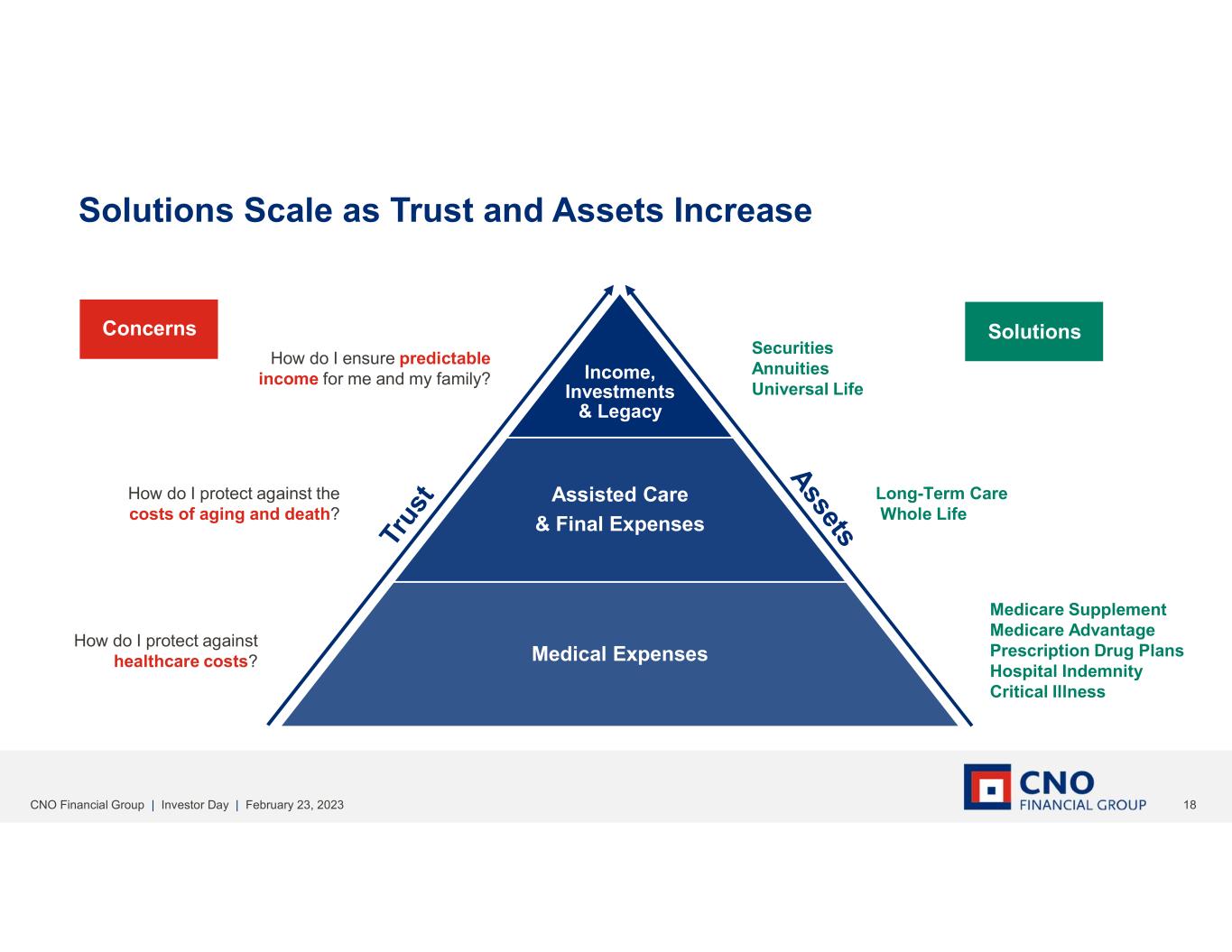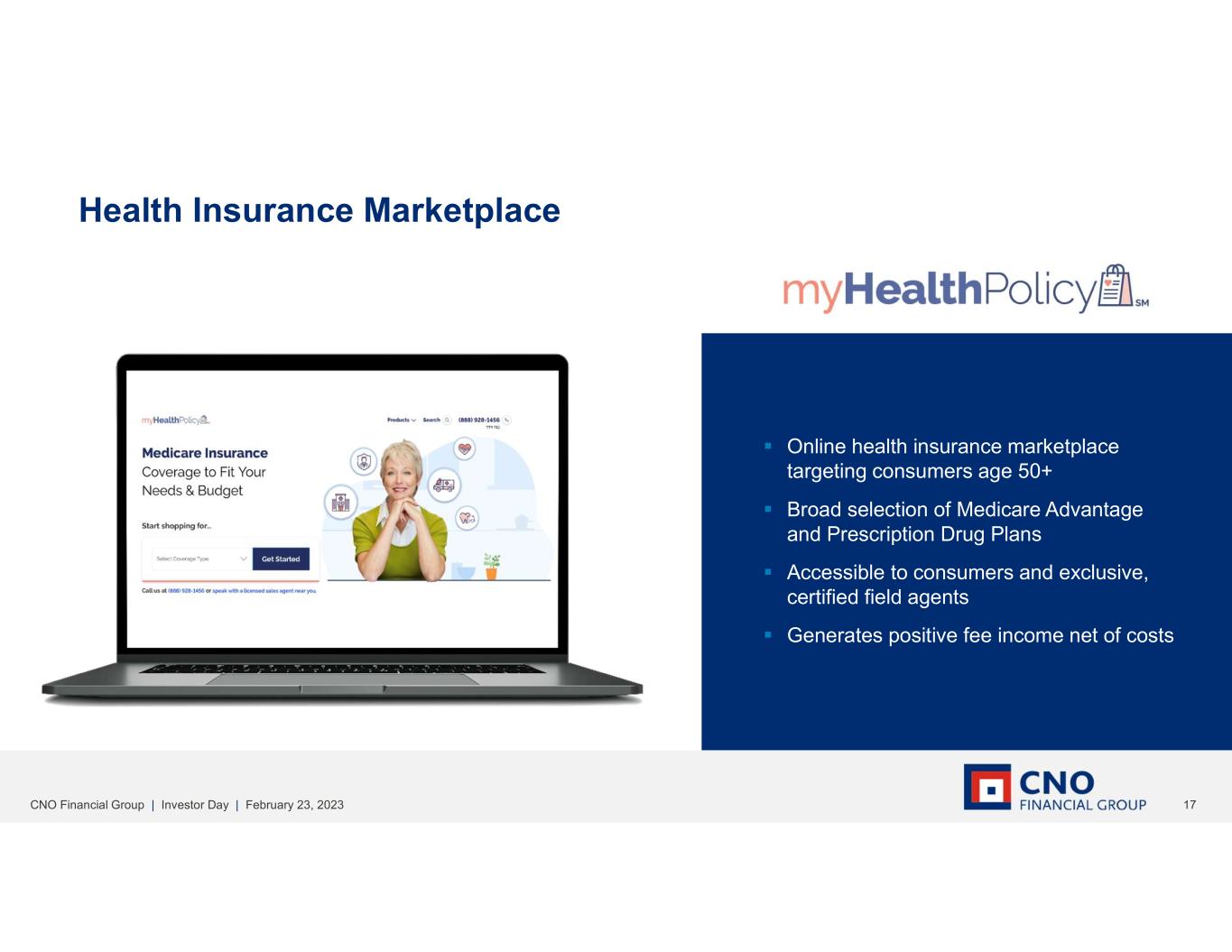 CNO Financial Group | Investor Day | February 23, 2023 17 Health Insurance Marketplace  Online health insurance marketplace targeting consumers age 50+  Broad selection of Medicare Advantage and Prescription Drug Plans  Accessible to consumers and exclusive, certified field agents  Generates positive fee income net of costs