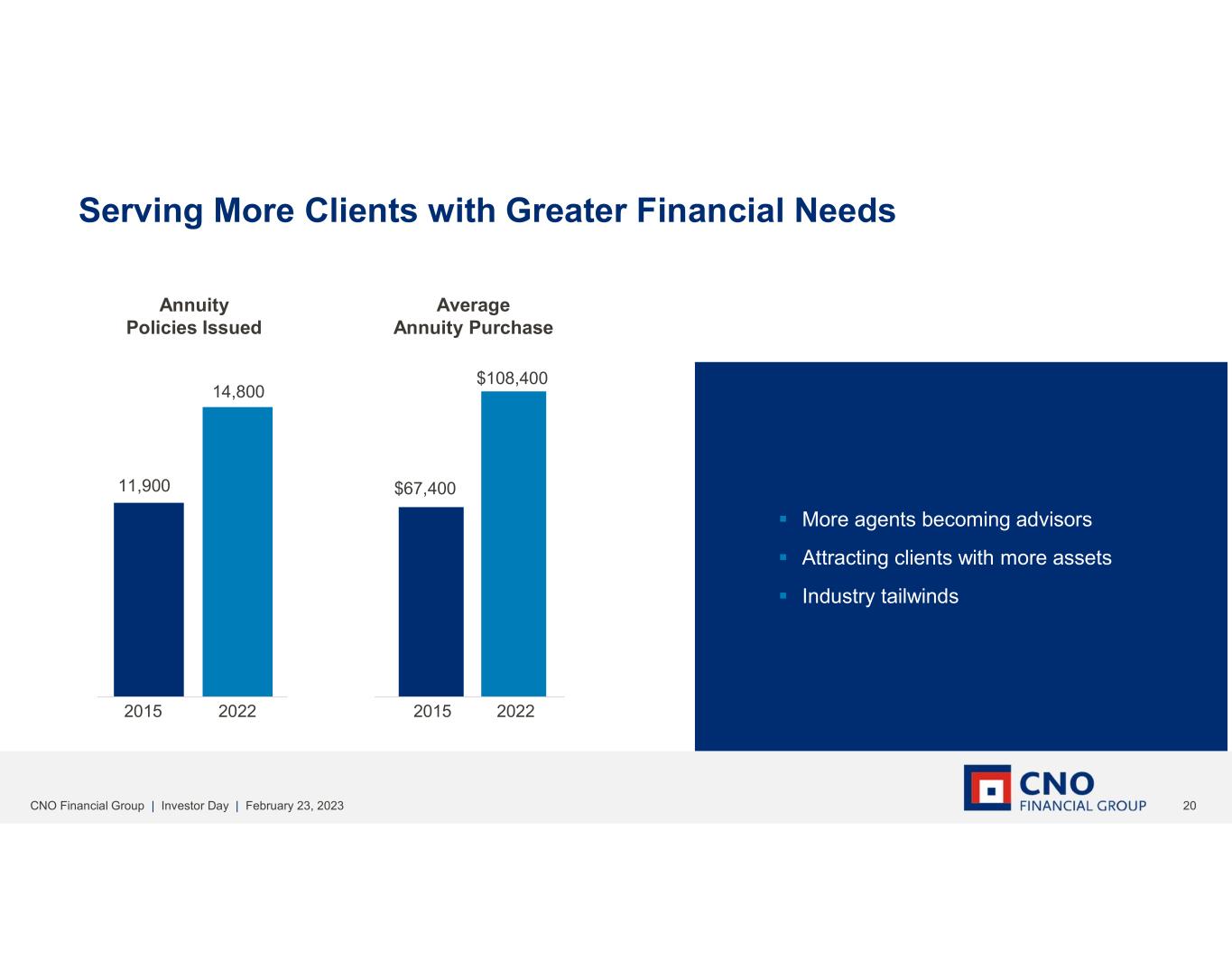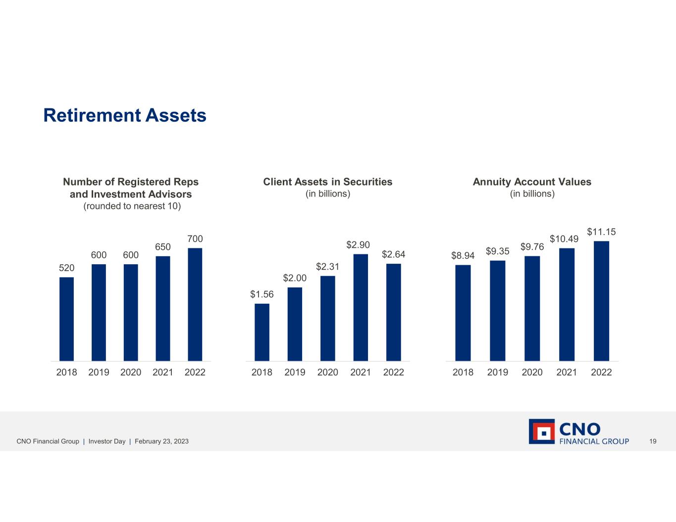 CNO Financial Group | Investor Day | February 23, 2023 19 Retirement Assets Client Assets in Securities (in billions) Number of Registered Reps and Investment Advisors (rounded to nearest 10) Annuity Account Values (in billions) 520 600 600 650 700 2018 2019 2020 2021 2022 $1.56 $2.00 $2.31 $2.90 $2.64 2018 2019 2020 2021 2022 $8.94 $9.35 $9.76 $10.49 $11.15 2018 2019 2020 2021 2022