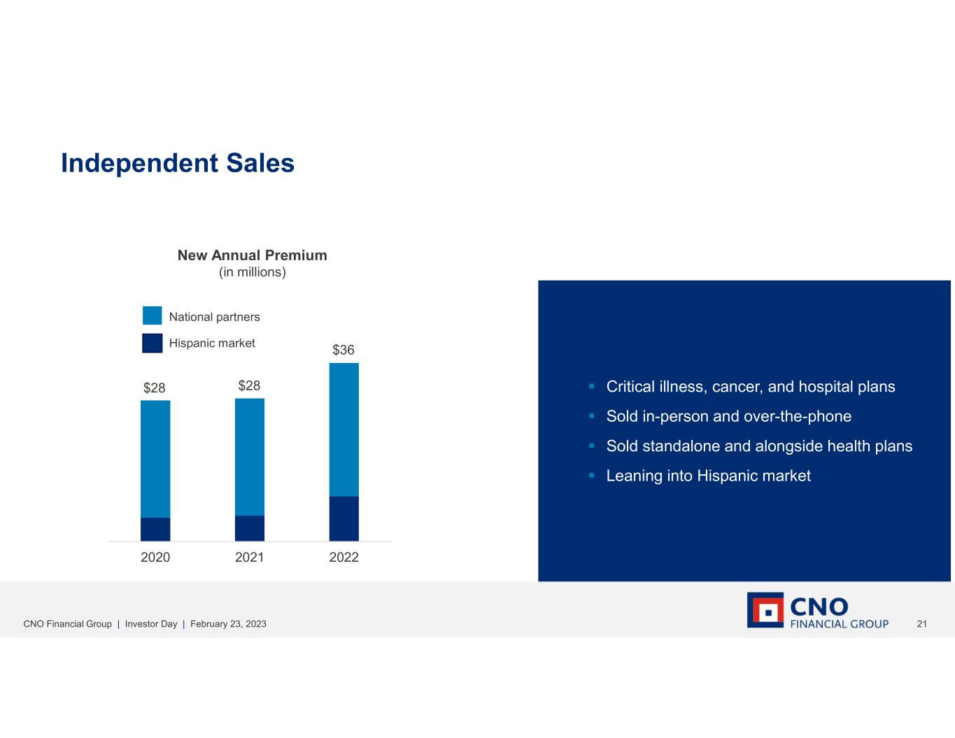 CNO Financial Group | Investor Day | February 23, 2023 21 Independent Sales 2020 2021 2022 Hispanic market National partners $28 $28 $36 New Annual Premium (in millions)  Critical illness, cancer, and hospital plans  Sold in-person and over-the-phone  Sold standalone and alongside health plans  Leaning into Hispanic market