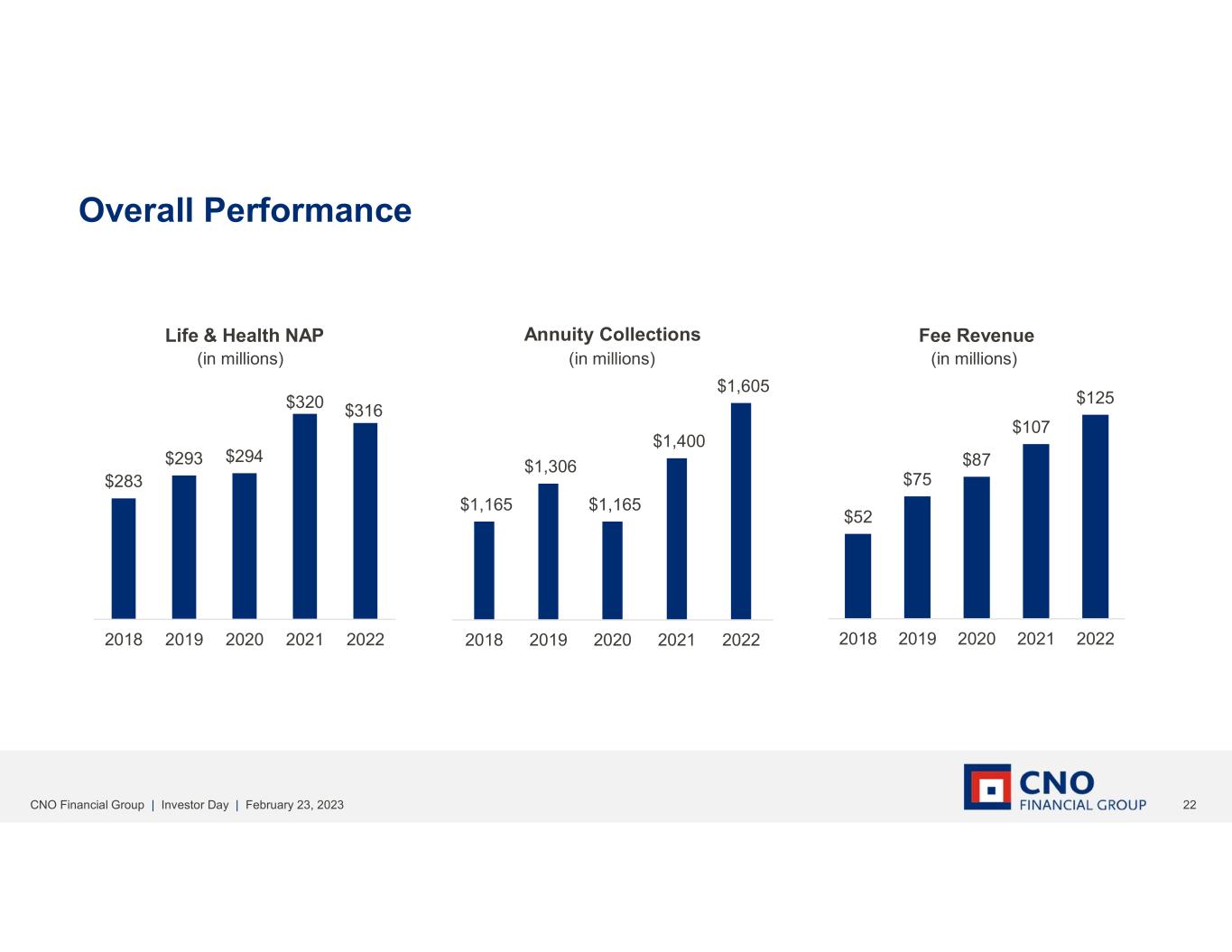 CNO Financial Group | Investor Day | February 23, 2023 22 Overall Performance Life & Health NAP Fee RevenueAnnuity Collections $283 $293 $294 $320 $316 2018 2019 2020 2021 2022 $52 $75 $87 $107 $125 2018 2019 2020 2021 2022 $1,165 $1,306 $1,165 $1,400 $1,605 2018 2019 2020 2021 2022 (in millions) (in millions) (in millions)