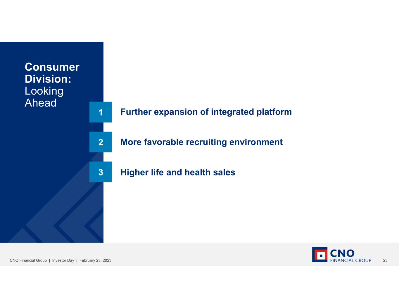 CNO Financial Group | Investor Day | February 23, 2023 23 Consumer Division: Looking Ahead Further expansion of integrated platform More favorable recruiting environment Higher life and health sales3 2 1
