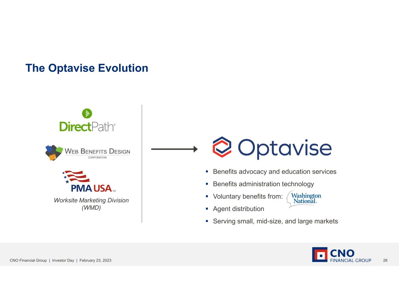 CNO Financial Group | Investor Day | February 23, 2023 25 Worksite Division: Key Takeaways Optavise is well positioned to capitalize on the evolution of workplace benefits Serve both employers and employees through a blend of people paired with technology Compelling market opportunity in the target markets we serve3 2 1