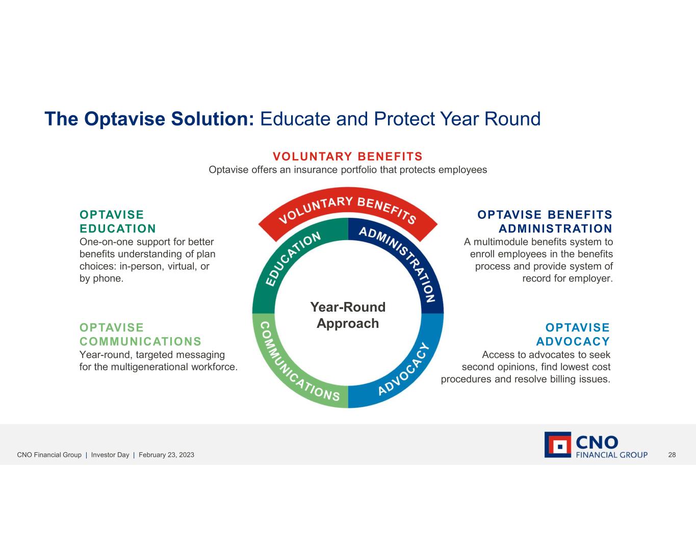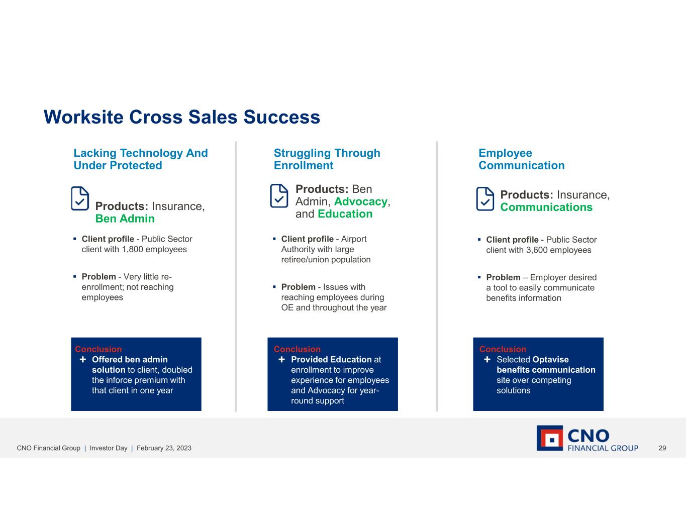 CNO Financial Group | Investor Day | February 23, 2023 28 The Optavise Solution: Educate and Protect Year Round Year-Round ApproachOPTAVISE COMMUNICATIONS Year-round, targeted messaging for the multigenerational workforce. OPTAVISE BENEFITS ADMINISTRATION A multimodule benefits system to enroll employees in the benefits process and provide system of record for employer. OPTAVISE ADVOCACY Access to advocates to seek second opinions, find lowest cost procedures and resolve billing issues. VOLUNTARY BENEFITS Optavise offers an insurance portfolio that protects employees OPTAVISE EDUCATION One-on-one support for better benefits understanding of plan choices: in-person, virtual, or by phone .