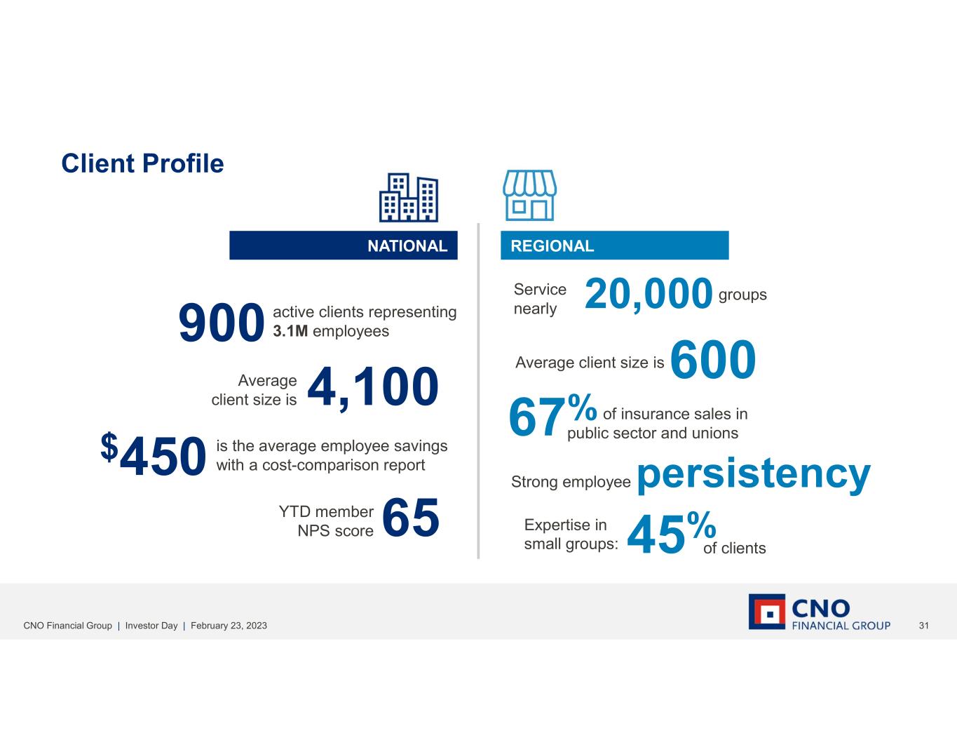 CNO Financial Group | Investor Day | February 23, 2023 30 Optavise Market Focus NATIONAL REGIONAL Products and Services  Year-round solutions ‒ Optavise education ‒ Optavise advocacy ‒ Optavise benefits administration ‒ Voluntary benefits products  Washington National voluntary benefits products  Optavise Group voluntary benefits products  Advocacy and Benefits Administration Distribution  Sold primarily through national brokers  Sold primarily through newly launched America’s broker channel and career agent force Recurring Revenue Model  90% annual recurring revenue  9-year average tenure for top 10 clients  Fee based  80% re-enrollment sales  Strong employer and employee persistency  Premium based