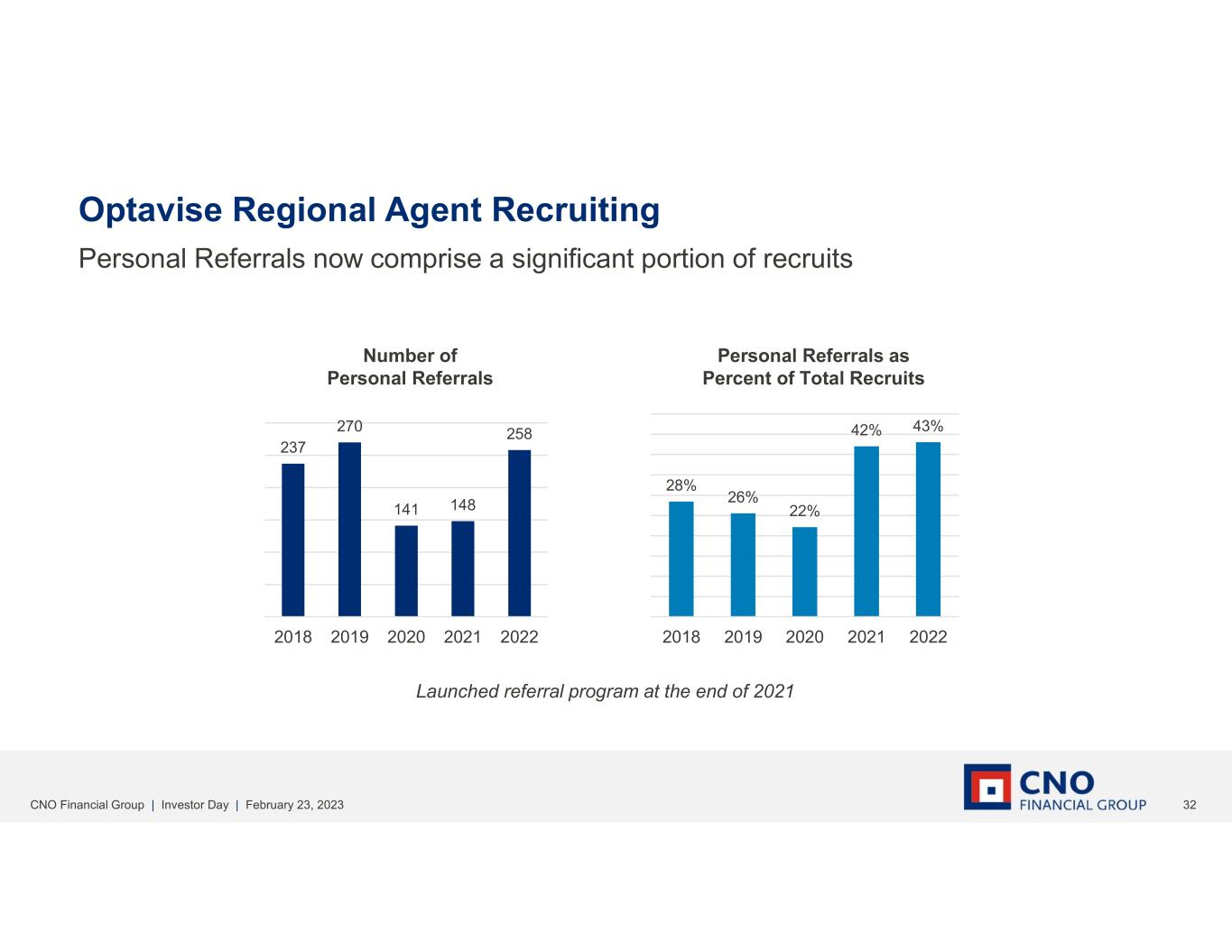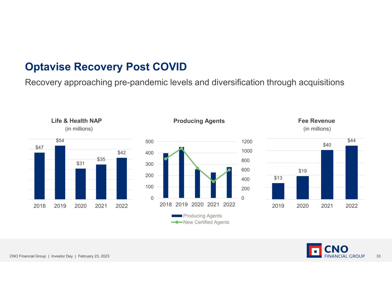 CNO Financial Group | Investor Day | February 23, 2023 32 Optavise Regional Agent Recruiting Number of Personal Referrals Personal Referrals as Percent of Total Recruits 28% 26% 22% 42% 43% 2018 2019 2020 2021 2022 237 270 141 148 258 2018 2019 2020 2021 2022 Launched referral program at the end of 2021 Personal Referrals now comprise a significant portion of recruits