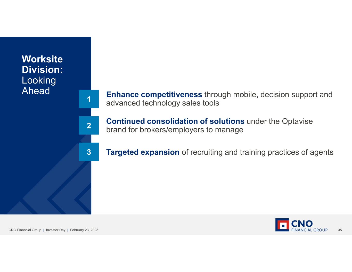 CNO Financial Group | Investor Day | February 23, 2023 35 Worksite Division: Looking Ahead Enhance competitiveness through mobile, decision support and advanced technology sales tools Continued consolidation of solutions under the Optavise brand for brokers/employers to manage Targeted expansion of recruiting and training practices of agents3 2 1