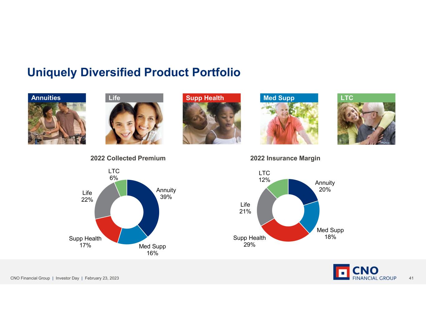 CNO Financial Group | Investor Day | February 23, 2023 40 Product Overview: Key Takeaways Uniquely diversified product portfolio enhances earnings stability and risk mitigation Broad product manufacturing capabilities supplemented by partner products Customer lifetime value and other metrics to maintain disciplined product management 3 2 1