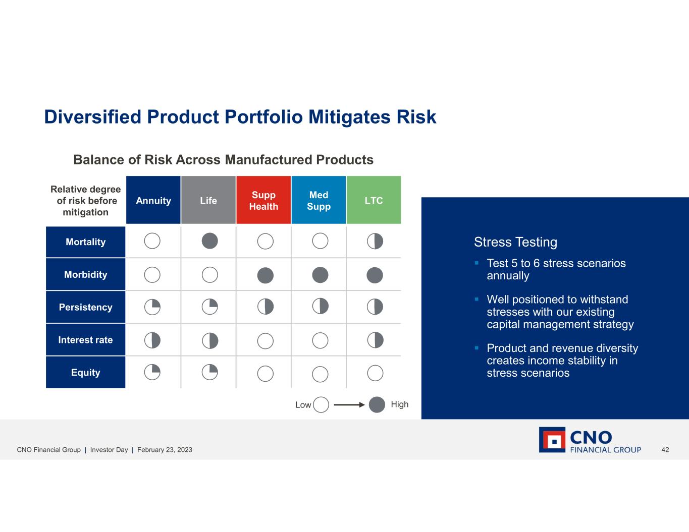 CNO Financial Group | Investor Day | February 23, 2023 41 Uniquely Diversified Product Portfolio Annuity 39% Med Supp 16% Supp Health 17% Life 22% LTC 6% Annuities Med SuppLife Supp Health Annuity 20% Med Supp 18%Supp Health 29% Life 21% LTC 12% 2022 Insurance Margin2022 Collected Premium LTC
