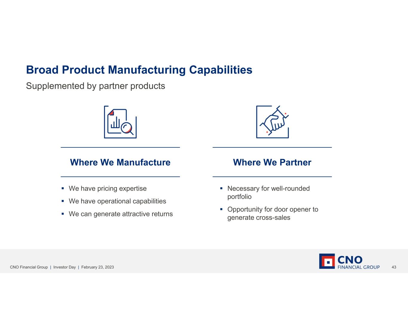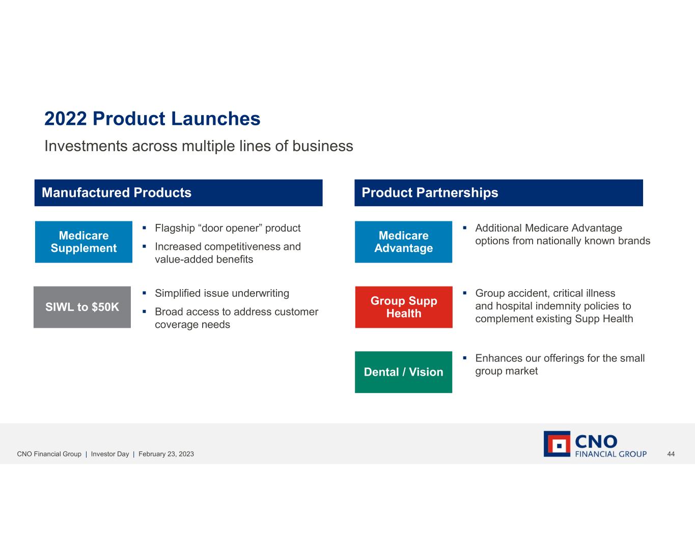 CNO Financial Group | Investor Day | February 23, 2023 43 Broad Product Manufacturing Capabilities Supplemented by partner products Where We Manufacture Where We Partner  We have pricing expertise  We have operational capabilities  We can generate attractive returns  Necessary for well-rounded portfolio  Opportunity for door opener to generate cross-sales