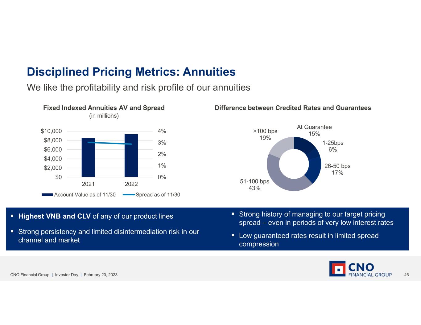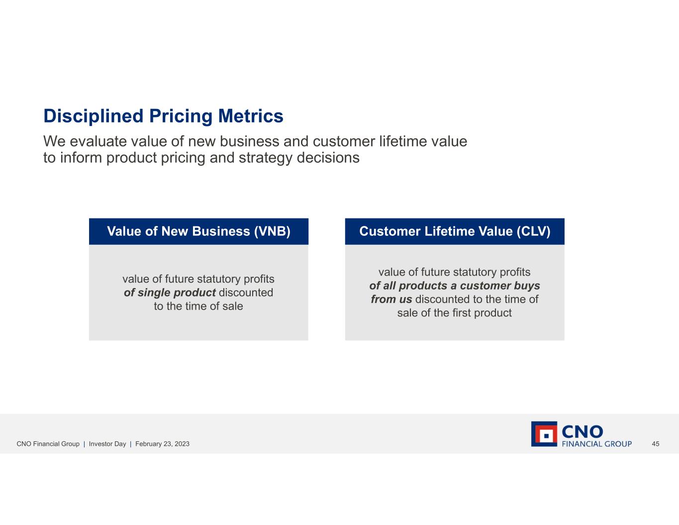 CNO Financial Group | Investor Day | February 23, 2023 45 We evaluate value of new business and customer lifetime value to inform product pricing and strategy decisions Disciplined Pricing Metrics value of future statutory profits of single product discounted to the time of sale value of future statutory profits of all products a customer buys from us discounted to the time of sale of the first product Value of New Business (VNB) Customer Lifetime Value (CLV)