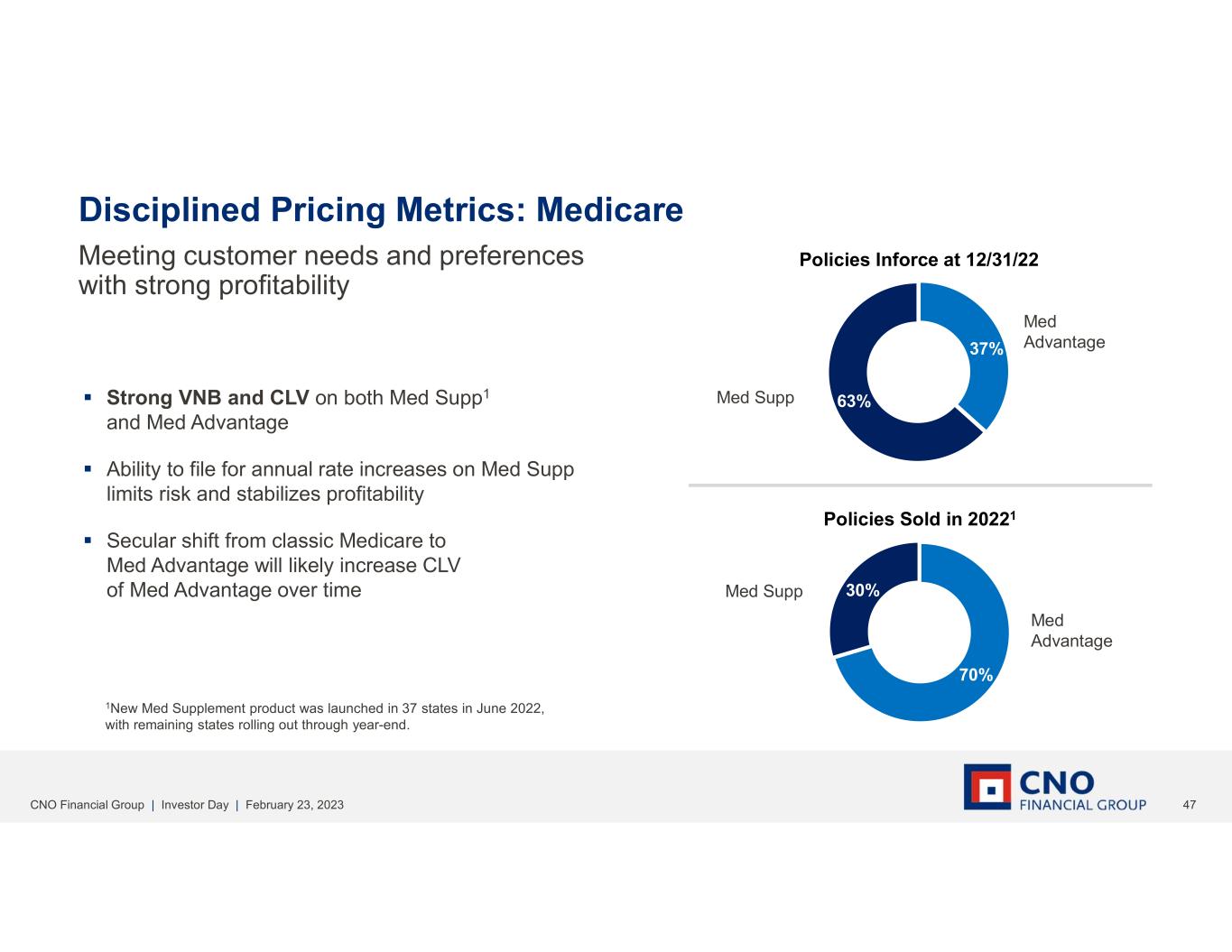 CNO Financial Group | Investor Day | February 23, 2023 47 37% 63% Policies Inforce at 12/31/22 Med Advantage Med Supp 70% 30% Policies Sold in 20221 Med Advantage Med Supp Disciplined Pricing Metrics: Medicare Meeting customer needs and preferences with strong profitability  Strong VNB and CLV on both Med Supp1 and Med Advantage  Ability to file for annual rate increases on Med Supp limits risk and stabilizes profitability  Secular shift from classic Medicare to Med Advantage will likely increase CLV of Med Advantage over time 1New Med Supplement product was launched in 37 states in June 2022, with remaining states rolling out through year-end.