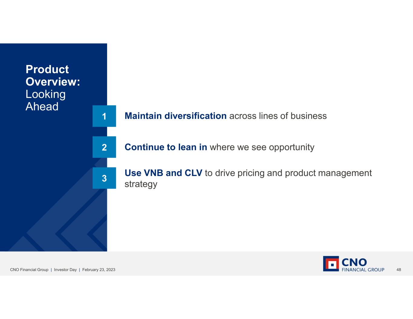 CNO Financial Group | Investor Day | February 23, 2023 48 Product Overview: Looking Ahead Maintain diversification across lines of business Continue to lean in where we see opportunity Use VNB and CLV to drive pricing and product management strategy 3 2 1