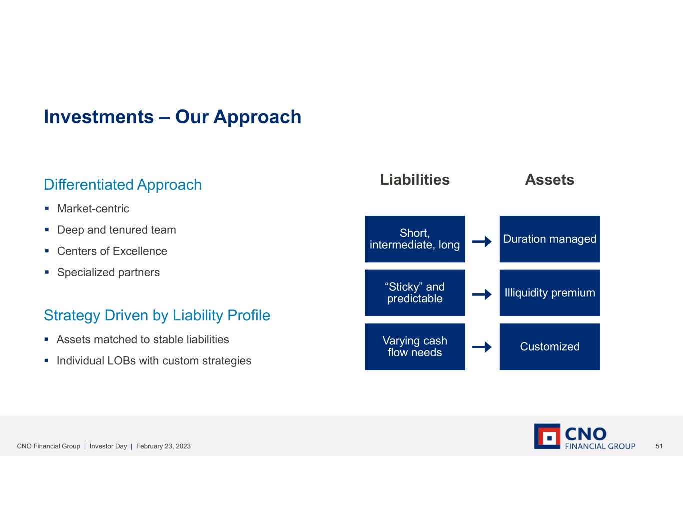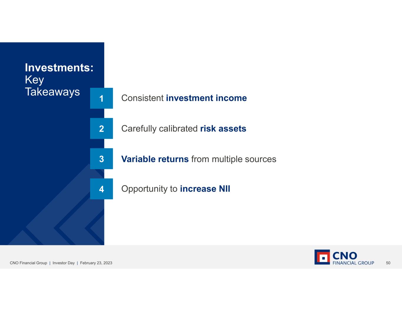 CNO Financial Group | Investor Day | February 23, 2023 50 Consistent investment income Carefully calibrated risk assets Opportunity to increase NII Variable returns from multiple sources 4 3 2 1 Investments: Key Takeaways