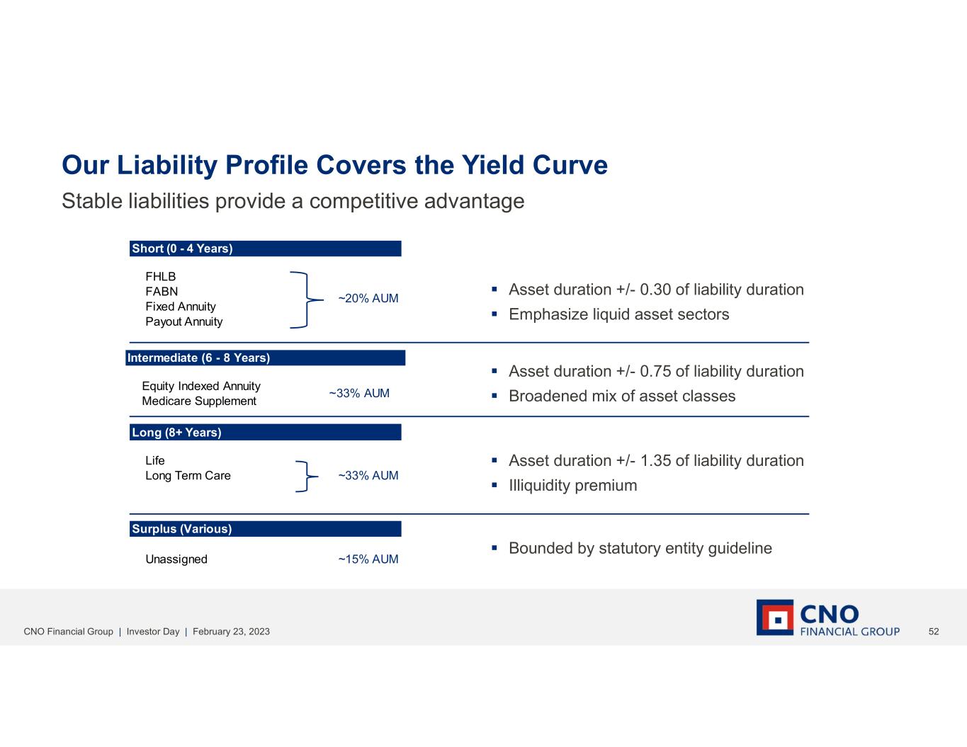 CNO Financial Group | Investor Day | February 23, 2023 51 Differentiated Approach Strategy Driven by Liability Profile Investments – Our Approach  Market-centric  Deep and tenured team  Centers of Excellence  Specialized partners  Assets matched to stable liabilities  Individual LOBs with custom strategies Liabilities Short, intermediate, long “Sticky” and predictable Varying cash flow needs Assets Duration managed Illiquidity premium Customized