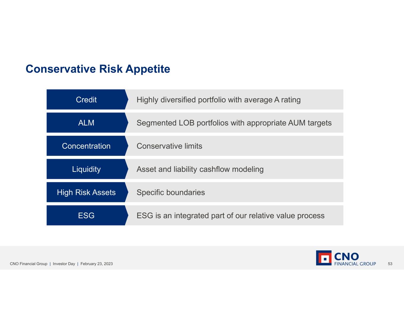 CNO Financial Group | Investor Day | February 23, 2023 53 Conservative Risk Appetite Credit Highly diversified portfolio with average A rating ALM Segmented LOB portfolios with appropriate AUM targets Concentration Conservative limits Liquidity Asset and liability cashflow modeling High Risk Assets Specific boundaries ESG ESG is an integrated part of our relative value process