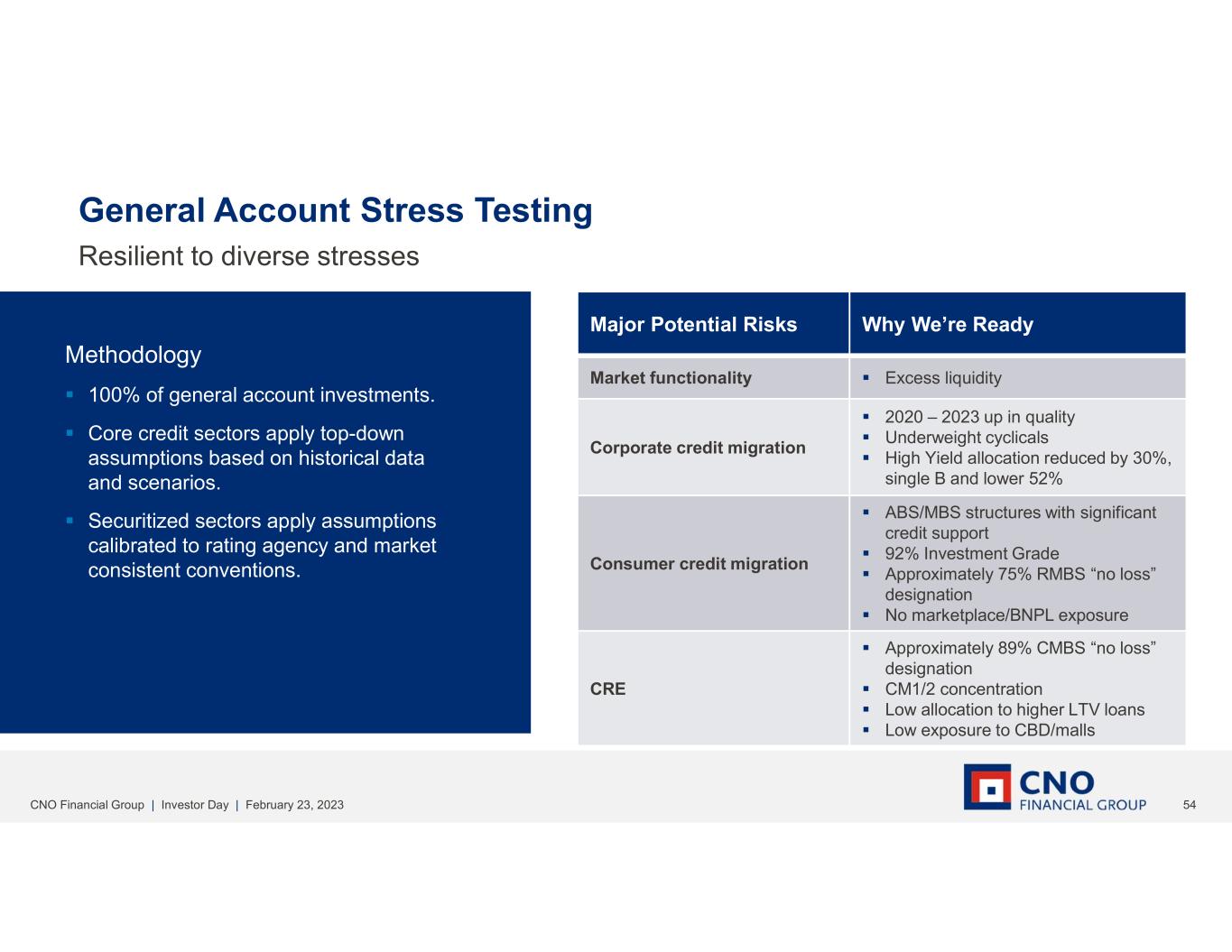 CNO Financial Group | Investor Day | February 23, 2023 54 Resilient to diverse stresses General Account Stress Testing Major Potential Risks Why We’re Ready Market functionality  Excess liquidity Corporate credit migration  2020 – 2023 up in quality  Underweight cyclicals  High Yield allocation reduced by 30%, single B and lower 52% Consumer credit migration  ABS/MBS structures with significant credit support  92% Investment Grade  Approximately 75% RMBS “no loss” designation  No marketplace/BNPL exposure CRE  Approximately 89% CMBS “no loss” designation  CM1/2 concentration  Low allocation to higher LTV loans  Low exposure to CBD/malls Methodology  100% of general account investments.  Core credit sectors apply top-down assumptions based on historical data and scenarios.  Securitized sectors apply assumptions calibrated to rating agency and market consistent conventions.