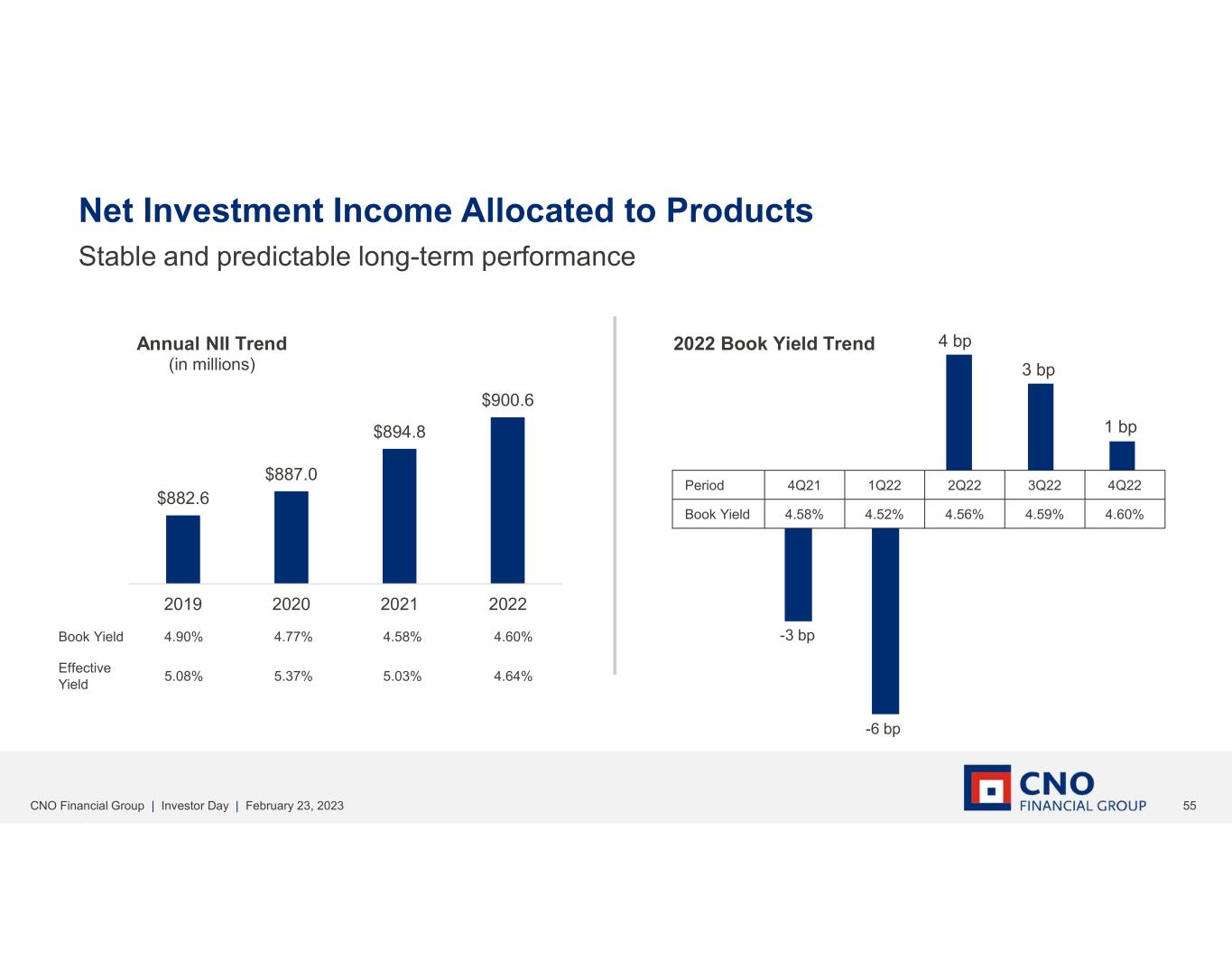 CNO Financial Group | Investor Day | February 23, 2023 55 $882.6 $887.0 $894.8 $900.6 2019 2020 2021 2022 Annual NII Trend (in millions) Stable and predictable long-term performance Net Investment Income Allocated to Products Book Yield 4.90% 4.77% 4.58% 4.60% Effective Yield 5.08% 5.37% 5.03% 4.64% Period 4Q21 1Q22 2Q22 3Q22 4Q22 Book Yield 4.58% 4.52% 4.56% 4.59% 4.60% -3 bp -6 bp 3 bp 1 bp 4 bp2022 Book Yield Trend