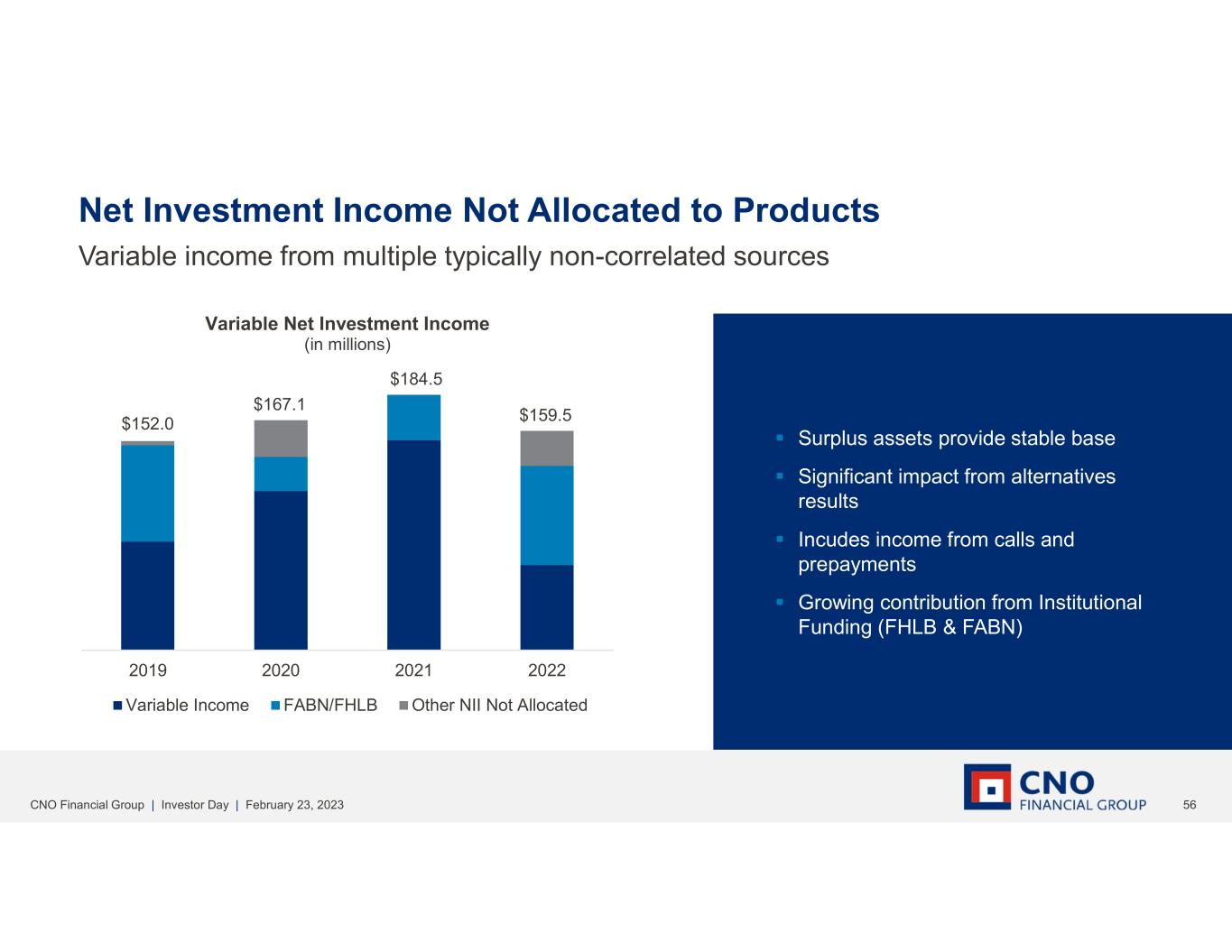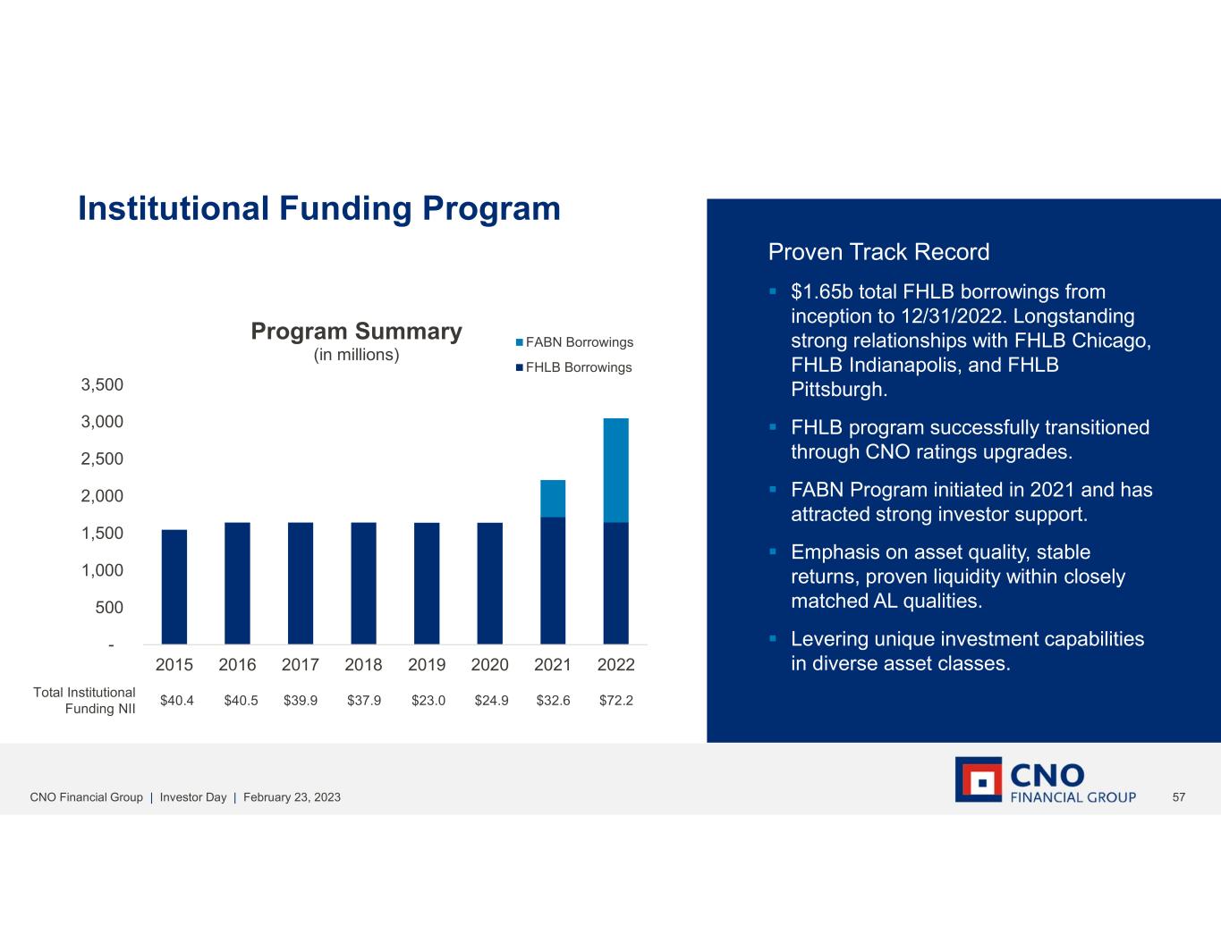 CNO Financial Group | Investor Day | February 23, 2023 56 Variable income from multiple typically non-correlated sources Net Investment Income Not Allocated to Products  Surplus assets provide stable base  Significant impact from alternatives results  Incudes income from calls and prepayments  Growing contribution from Institutional Funding (FHLB & FABN) 2019 2020 2021 2022 Variable Net Investment Income (in millions) Variable Income FABN/FHLB Other NII Not Allocated $152.0 $167.1 $184.5 $159.5
