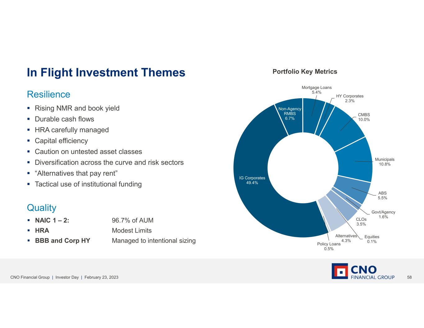 CNO Financial Group | Investor Day | February 23, 2023 58  Rising NMR and book yield  Durable cash flows  HRA carefully managed  Capital efficiency  Caution on untested asset classes  Diversification across the curve and risk sectors  “Alternatives that pay rent”  Tactical use of institutional funding  NAIC 1 – 2: 96.7% of AUM  HRA Modest Limits  BBB and Corp HY Managed to intentional sizing In Flight Investment Themes Resilience Quality IG Corporates 49.4% Non-Agency RMBS 6.7% Mortgage Loans 5.4% HY Corporates 2.3% CMBS 10.0% Municipals 10.8% ABS 5.5% Govt/Agency 1.6% CLOs 3.5% Equities 0.1% Alternatives 4.3% Policy Loans 0.5% Portfolio Key Metrics