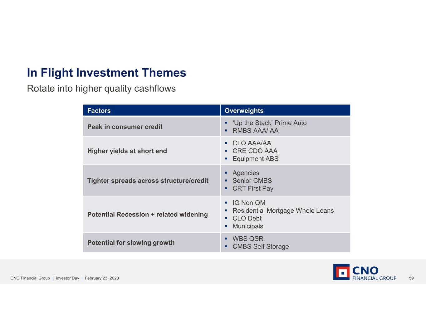 CNO Financial Group | Investor Day | February 23, 2023 59 In Flight Investment Themes Rotate into higher quality cashflows Factors Overweights Peak in consumer credit  ‘Up the Stack’ Prime Auto  RMBS AAA/ AA Higher yields at short end  CLO AAA/AA  CRE CDO AAA  Equipment ABS Tighter spreads across structure/credit  Agencies  Senior CMBS  CRT First Pay Potential Recession + related widening  IG Non QM  Residential Mortgage Whole Loans  CLO Debt  Municipals Potential for slowing growth  WBS QSR  CMBS Self Storage
