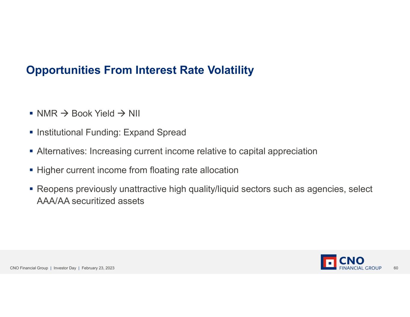 CNO Financial Group | Investor Day | February 23, 2023 60 Opportunities From Interest Rate Volatility  NMR  Book Yield  NII  Institutional Funding: Expand Spread  Alternatives: Increasing current income relative to capital appreciation  Higher current income from floating rate allocation  Reopens previously unattractive high quality/liquid sectors such as agencies, select AAA/AA securitized assets