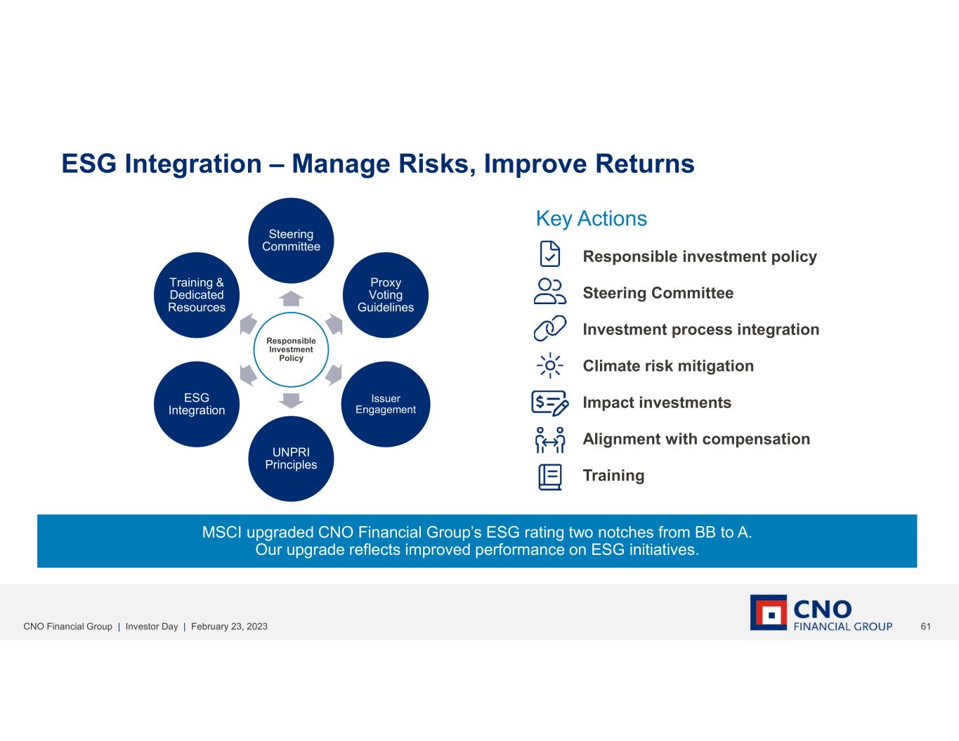 CNO Financial Group | Investor Day | February 23, 2023 61 ESG Integration – Manage Risks, Improve Returns Responsible Investment Policy Steering Committee Proxy Voting Guidelines Issuer Engagement UNPRI Principles ESG Integration Training & Dedicated Resources MSCI upgraded CNO Financial Group’s ESG rating two notches from BB to A. Our upgrade reflects improved performance on ESG initiatives. Key Actions Responsible investment policy Steering Committee Investment process integration Climate risk mitigation Impact investments Alignment with compensation Training