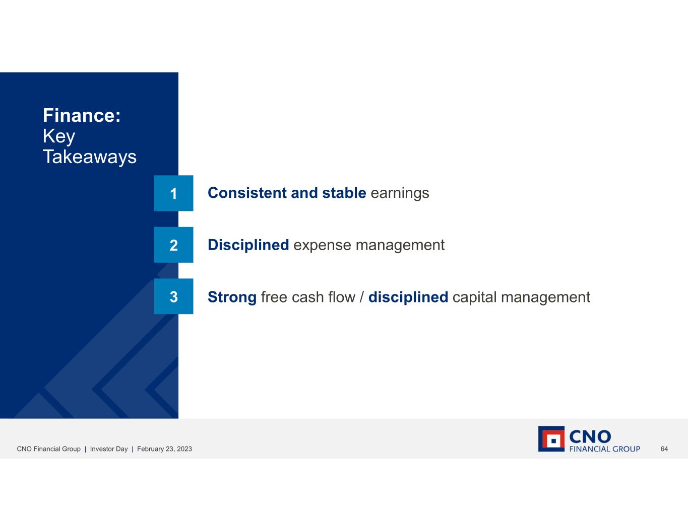 CNO Financial Group | Investor Day | February 23, 2023 63 Finance Paul McDonough Chief Financial Officer