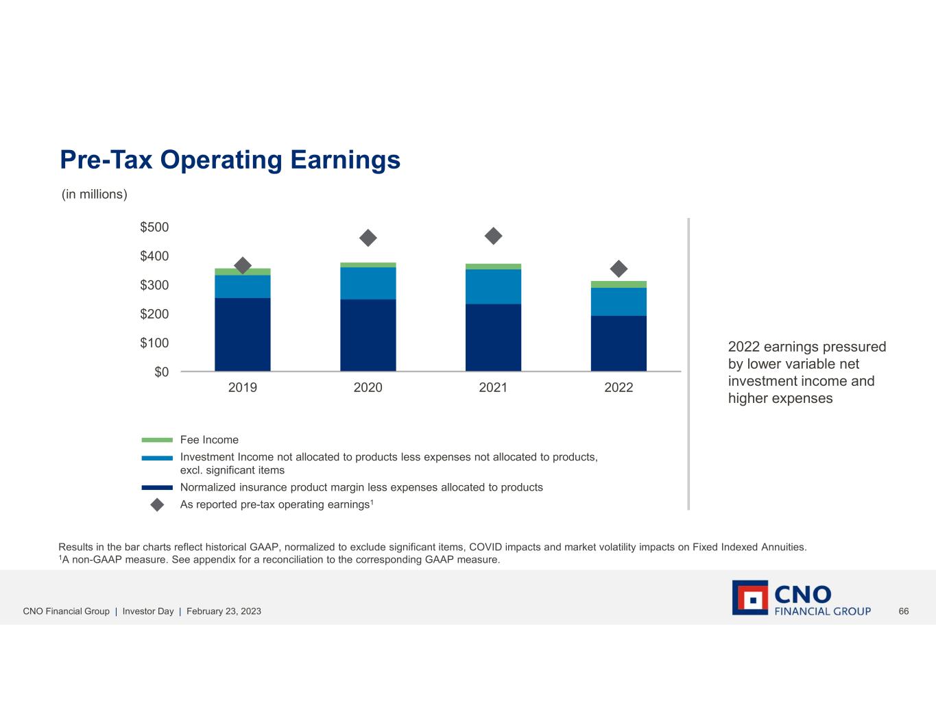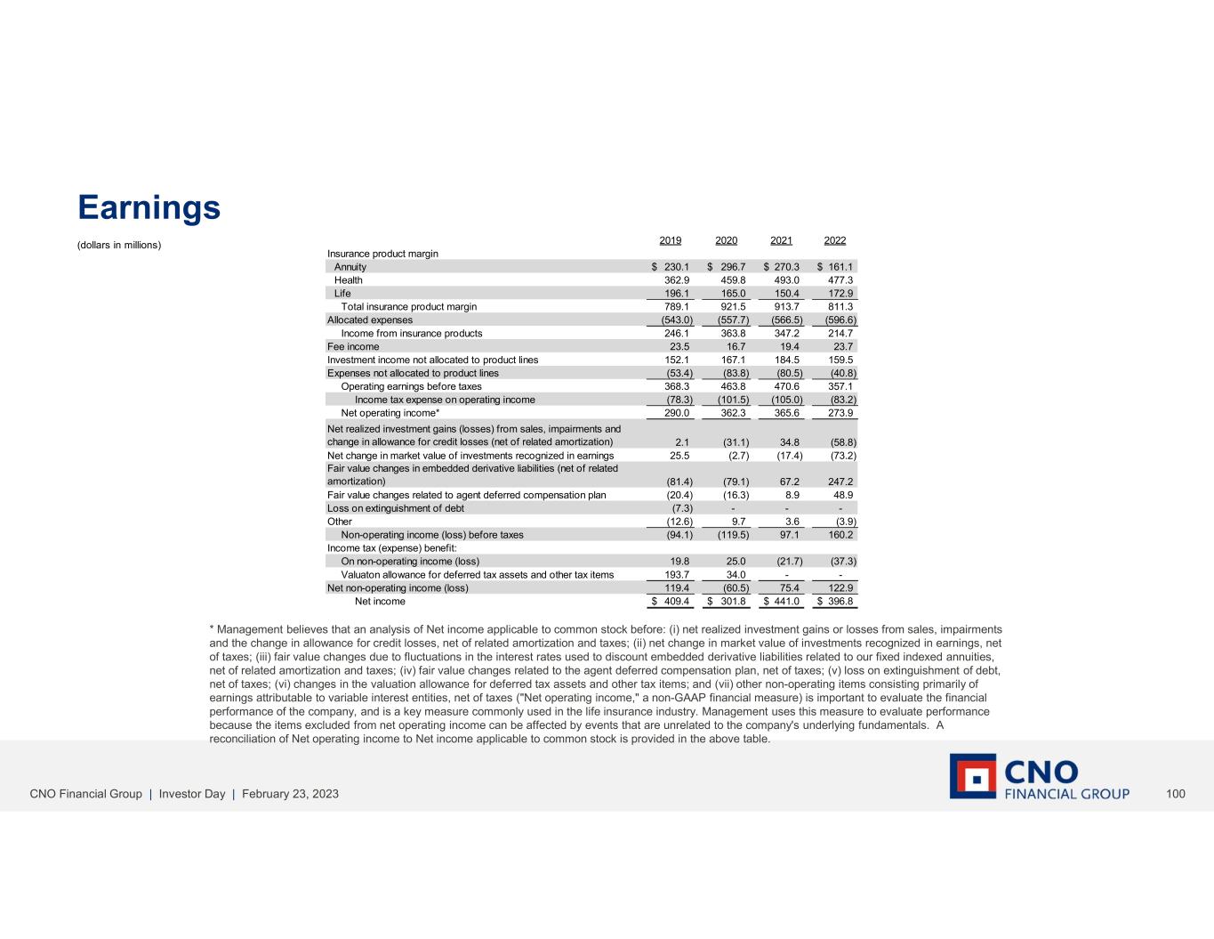 CNO Financial Group | Investor Day | February 23, 2023 100 Earnings 2019 2020 2021 2022 Insurance product margin Annuity 230.1$ 296.7$ 270.3$ 161.1$ Health 362.9 459.8 493.0 477.3 Life 196.1 165.0 150.4 172.9 Total insurance product margin 789.1 921.5 913.7 811.3 Allocated expenses (543.0) (557.7) (566.5) (596.6) Income from insurance products 246.1 363.8 347.2 214.7 Fee income 23.5 16.7 19.4 23.7 Investment income not allocated to product lines 152.1 167.1 184.5 159.5 Expenses not allocated to product lines (53.4) (83.8) (80.5) (40.8) Operating earnings before taxes 368.3 463.8 470.6 357.1 Income tax expense on operating income (78.3) (101.5) (105.0) (83.2) Net operating income* 290.0 362.3 365.6 273.9 Net realized investment gains (losses) from sales, impairments and change in allowance for credit losses (net of related amortization) 2.1 (31.1) 34.8 (58.8) Net change in market value of investments recognized in earnings 25.5 (2.7) (17.4) (73.2) Fair value changes in embedded derivative liabilities (net of related amortization) (81.4) (79.1) 67.2 247.2 Fair value changes related to agent deferred compensation plan (20.4) (16.3) 8.9 48.9 Loss on extinguishment of debt (7.3) - - - Other (12.6) 9.7 3.6 (3.9) Non-operating income (loss) before taxes (94.1) (119.5) 97.1 160.2 Income tax (expense) benefit: On non-operating income (loss) 19.8 25.0 (21.7) (37.3) Valuaton allowance for deferred tax assets and other tax items 193.7 34.0 - - Net non-operating income (loss) 119.4 (60.5) 75.4 122.9 Net income 409.4$ 301.8$ 441.0$ 396.8$ * Management believes that an analysis of Net income applicable to common stock before: (i) net realized investment gains or losses from sales, impairments and the change in allowance for credit losses, net of related amortization and taxes; (ii) net change in market value of investments recognized in earnings, net of taxes; (iii) fair value changes due to fluctuations in the interest rates used to discount embedded derivative liabilities related to our fixed indexed annuities, net of related amortization and taxes; (iv) fair value changes related to the agent deferred compensation plan, net of taxes; (v) loss on extinguishment of debt, net of taxes; (vi) changes in the valuation allowance for deferred tax assets and other tax items; and (vii) other non-operating items consisting primarily of earnings attributable to variable interest entities, net of taxes ("Net operating income," a non-GAAP financial measure) is important to evaluate the financial performance of the company, and is a key measure commonly used in the life insurance industry. Management uses this measure to evaluate performance because the items excluded from net operating income can be affected by events that are unrelated to the company's underlying fundamentals. A reconciliation of Net operating income to Net income applicable to common stock is provided in the above table. (dollars in millions)