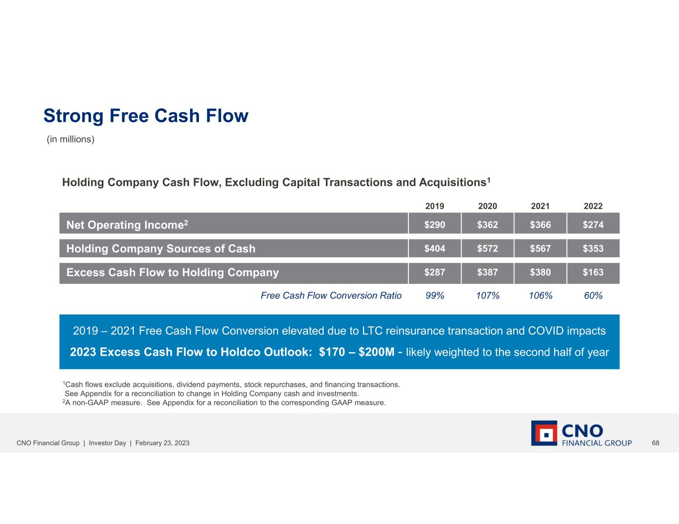 CNO Financial Group | Investor Day | February 23, 2023 68 2019 2020 2021 2022 Net Operating Income2 $290 $362 $366 $274 Holding Company Sources of Cash $404 $572 $567 $353 Excess Cash Flow to Holding Company $287 $387 $380 $163 Free Cash Flow Conversion Ratio 99% 107% 106% 60% Strong Free Cash Flow 1Cash flows exclude acquisitions, dividend payments, stock repurchases, and financing transactions. See Appendix for a reconciliation to change in Holding Company cash and investments. 2A non-GAAP measure. See Appendix for a reconciliation to the corresponding GAAP measure. Holding Company Cash Flow, Excluding Capital Transactions and Acquisitions1 2019 – 2021 Free Cash Flow Conversion elevated due to LTC reinsurance transaction and COVID impacts 2023 Excess Cash Flow to Holdco Outlook: $170 – $200M - likely weighted to the second half of year (in millions)