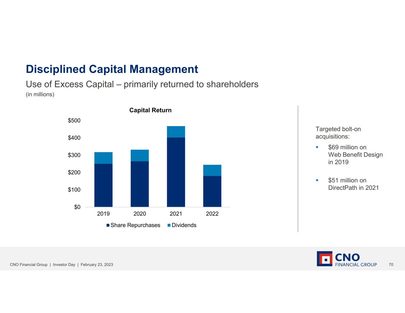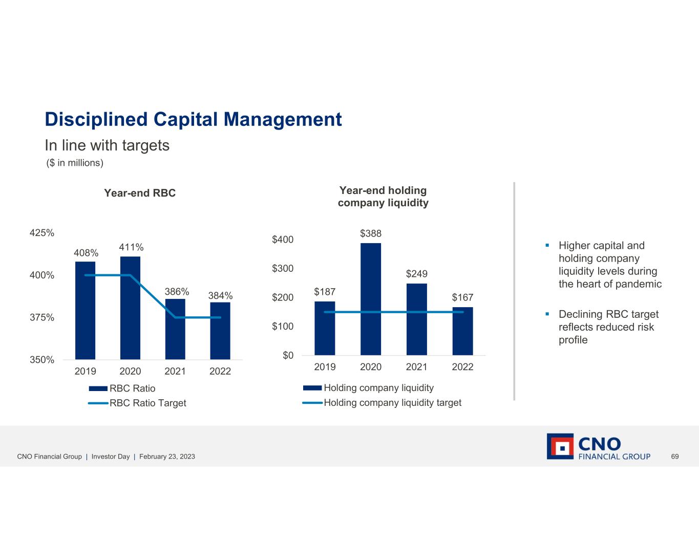 CNO Financial Group | Investor Day | February 23, 2023 69  Higher capital and holding company liquidity levels during the heart of pandemic  Declining RBC target reflects reduced risk profile Disciplined Capital Management In line with targets 350% 375% 400% 425% 2019 2020 2021 2022 Year-end RBC RBC Ratio RBC Ratio Target 408% 411% 386% 384% $187 $388 $249 $167 $0 $100 $200 $300 $400 2019 2020 2021 2022 Year-end holding company liquidity Holding company liquidity Holding company liquidity target ($ in millions)