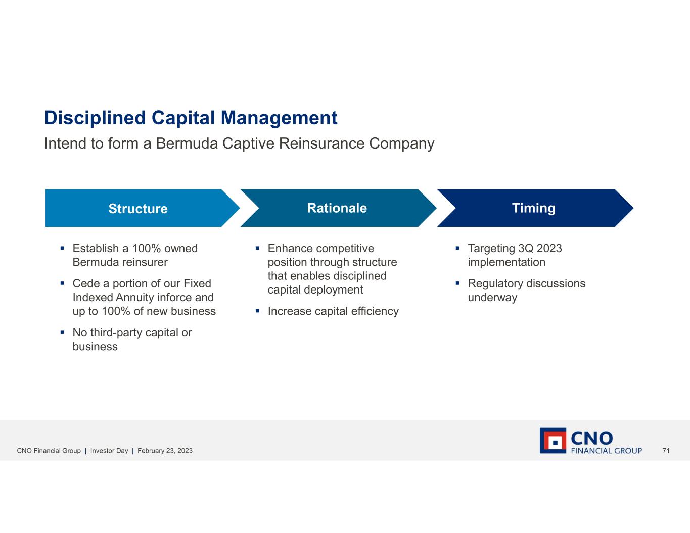 CNO Financial Group | Investor Day | February 23, 2023 71 Intend to form a Bermuda Captive Reinsurance Company Disciplined Capital Management Rationale TimingStructure  Establish a 100% owned Bermuda reinsurer  Cede a portion of our Fixed Indexed Annuity inforce and up to 100% of new business  No third-party capital or business  Enhance competitive position through structure that enables disciplined capital deployment  Increase capital efficiency  Targeting 3Q 2023 implementation  Regulatory discussions underway