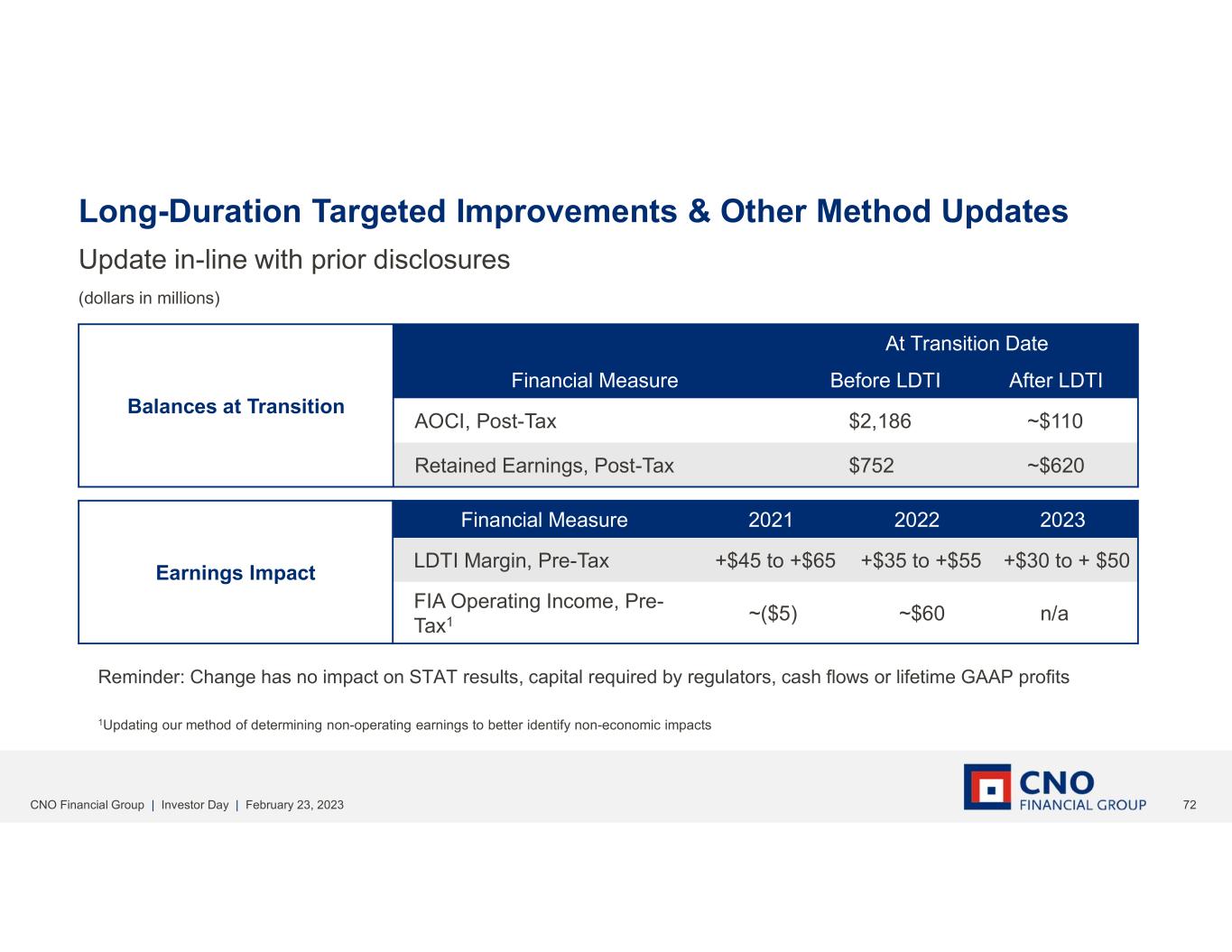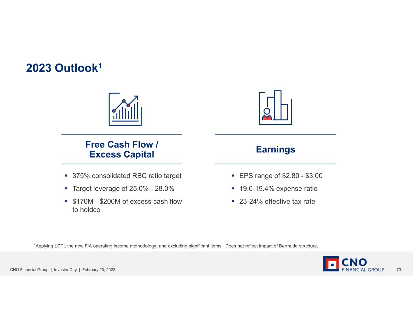 CNO Financial Group | Investor Day | February 23, 2023 72 Update in-line with prior disclosures Long-Duration Targeted Improvements & Other Method Updates Balances at Transition At Transition Date Financial Measure Before LDTI After LDTI AOCI, Post-Tax $2,186 ~$110 Retained Earnings, Post-Tax $752 ~$620 Earnings Impact Financial Measure 2021 2022 2023 LDTI Margin, Pre-Tax +$45 to +$65 +$35 to +$55 +$30 to + $50 FIA Operating Income, Pre- Tax1 ~($5) ~$60 n/a 1Updating our method of determining non-operating earnings to better identify non-economic impacts (dollars in millions) Reminder: Change has no impact on STAT results, capital required by regulators, cash flows or lifetime GAAP profits