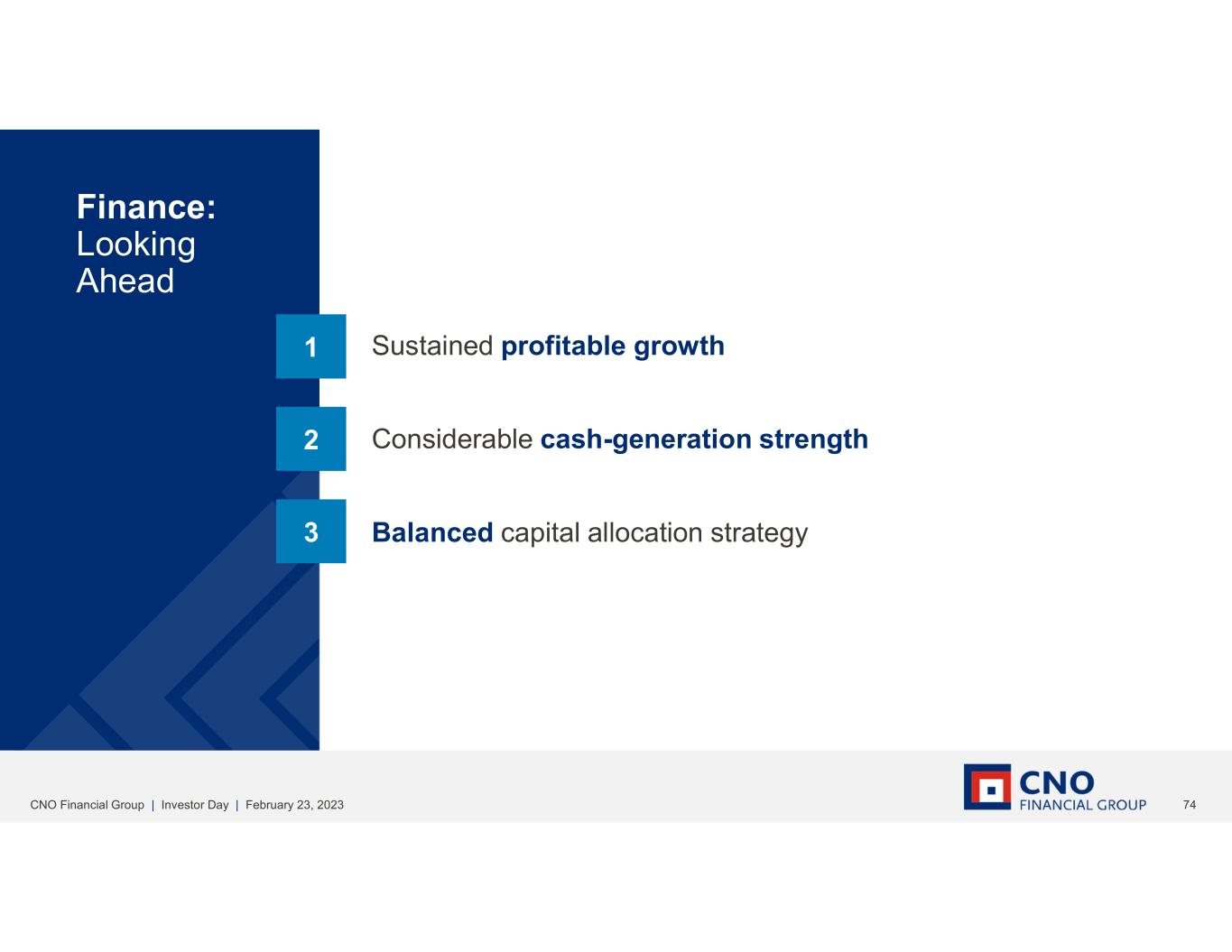 CNO Financial Group | Investor Day | February 23, 2023 74 Finance: Looking Ahead Sustained profitable growth Considerable cash-generation strength Balanced capital allocation strategy3 2 1
