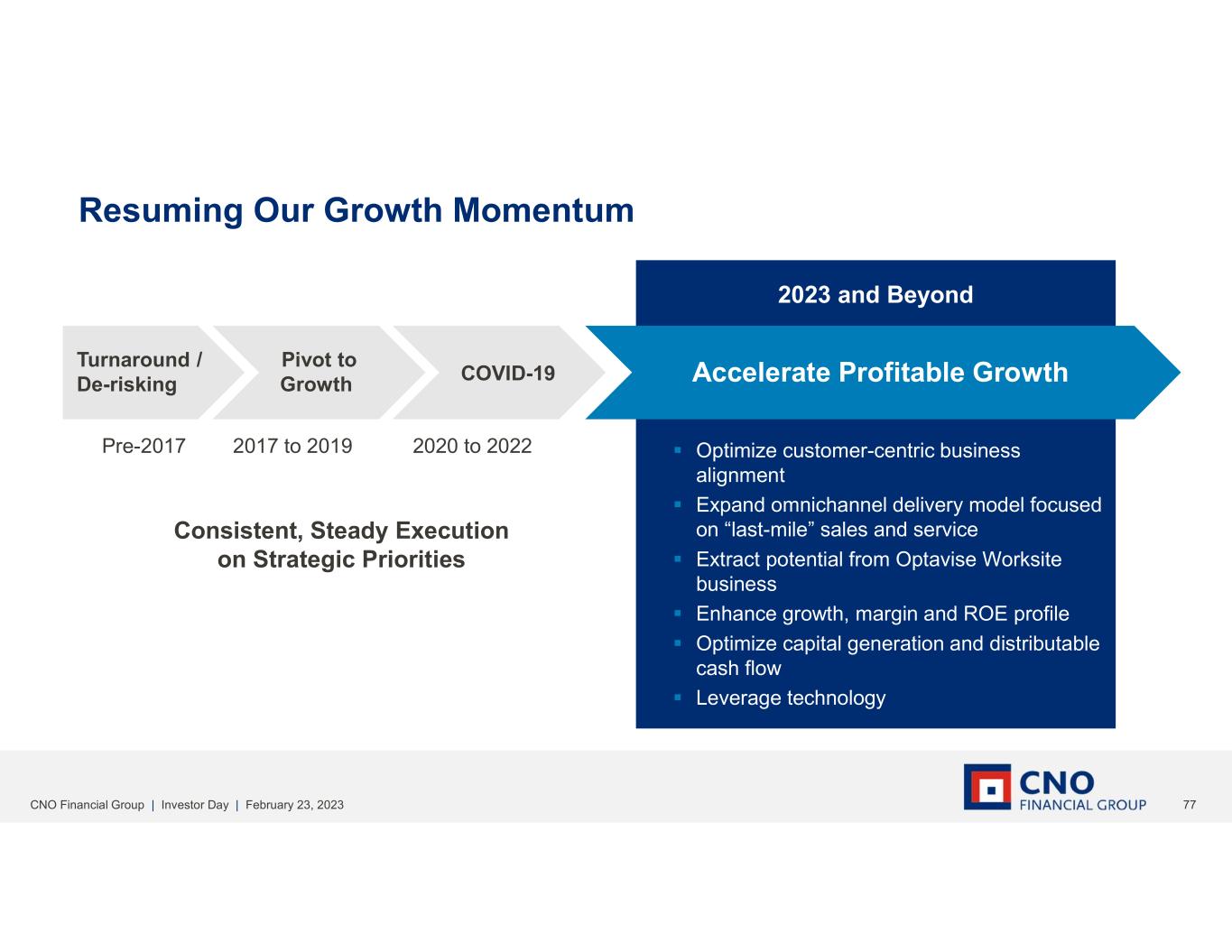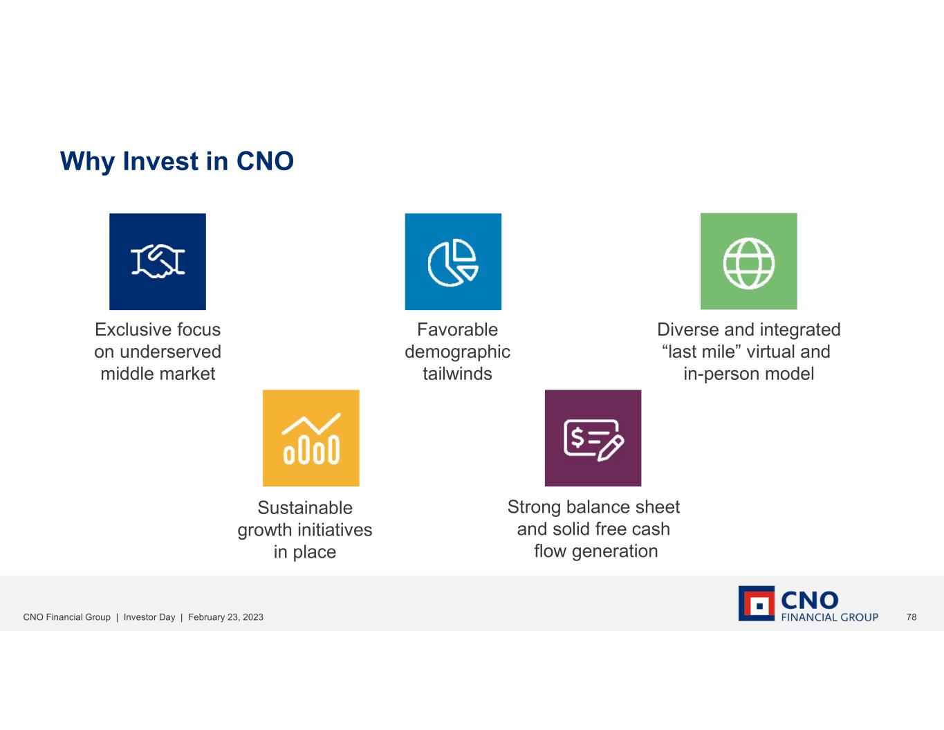 CNO Financial Group | Investor Day | February 23, 2023 77 Resuming Our Growth Momentum Turnaround / De-risking Pivot to Growth Pre-2017 2017 to 2019 2020 to 2022 COVID-19 Accelerate Profitable Growth  Optimize customer-centric business alignment  Expand omnichannel delivery model focused on “last-mile” sales and service  Extract potential from Optavise Worksite business  Enhance growth, margin and ROE profile  Optimize capital generation and distributable cash flow  Leverage technology 2023 and Beyond Consistent, Steady Execution on Strategic Priorities