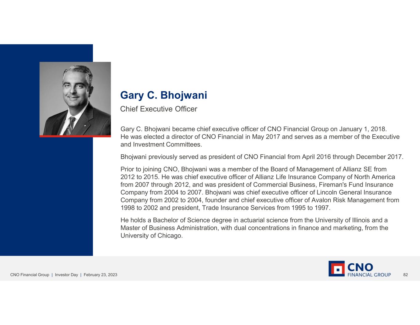 CNO Financial Group | Investor Day | February 23, 2023 82 Gary C. Bhojwani Chief Executive Officer Gary C. Bhojwani became chief executive officer of CNO Financial Group on January 1, 2018. He was elected a director of CNO Financial in May 2017 and serves as a member of the Executive and Investment Committees. Bhojwani previously served as president of CNO Financial from April 2016 through December 2017. Prior to joining CNO, Bhojwani was a member of the Board of Management of Allianz SE from 2012 to 2015. He was chief executive officer of Allianz Life Insurance Company of North America from 2007 through 2012, and was president of Commercial Business, Fireman's Fund Insurance Company from 2004 to 2007. Bhojwani was chief executive officer of Lincoln General Insurance Company from 2002 to 2004, founder and chief executive officer of Avalon Risk Management from 1998 to 2002 and president, Trade Insurance Services from 1995 to 1997. He holds a Bachelor of Science degree in actuarial science from the University of Illinois and a Master of Business Administration, with dual concentrations in finance and marketing, from the University of Chicago.