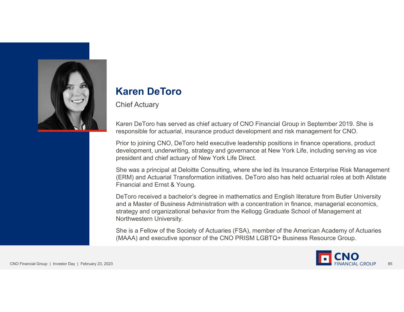 CNO Financial Group | Investor Day | February 23, 2023 85 Karen DeToro Chief Actuary Karen DeToro has served as chief actuary of CNO Financial Group in September 2019. She is responsible for actuarial, insurance product development and risk management for CNO. Prior to joining CNO, DeToro held executive leadership positions in finance operations, product development, underwriting, strategy and governance at New York Life, including serving as vice president and chief actuary of New York Life Direct. She was a principal at Deloitte Consulting, where she led its Insurance Enterprise Risk Management (ERM) and Actuarial Transformation initiatives. DeToro also has held actuarial roles at both Allstate Financial and Ernst & Young. DeToro received a bachelor’s degree in mathematics and English literature from Butler University and a Master of Business Administration with a concentration in finance, managerial economics, strategy and organizational behavior from the Kellogg Graduate School of Management at Northwestern University. She is a Fellow of the Society of Actuaries (FSA), member of the American Academy of Actuaries (MAAA) and executive sponsor of the CNO PRISM LGBTQ+ Business Resource Group.