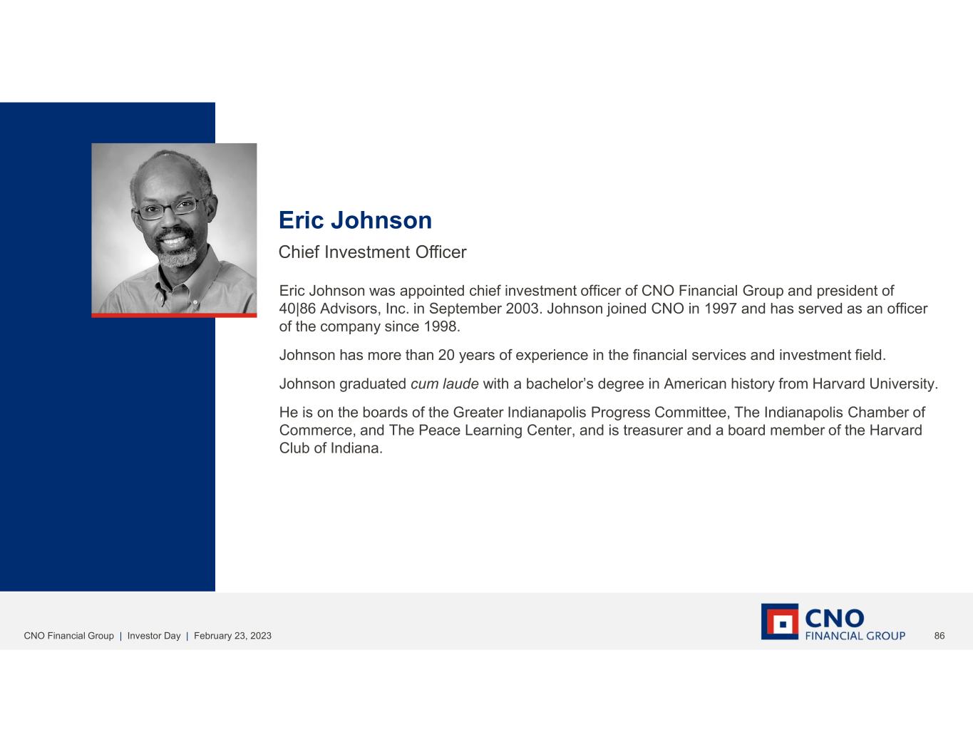 CNO Financial Group | Investor Day | February 23, 2023 86 Eric Johnson Chief Investment Officer Eric Johnson was appointed chief investment officer of CNO Financial Group and president of 40|86 Advisors, Inc. in September 2003. Johnson joined CNO in 1997 and has served as an officer of the company since 1998. Johnson has more than 20 years of experience in the financial services and investment field. Johnson graduated cum laude with a bachelor’s degree in American history from Harvard University. He is on the boards of the Greater Indianapolis Progress Committee, The Indianapolis Chamber of Commerce, and The Peace Learning Center, and is treasurer and a board member of the Harvard Club of Indiana.