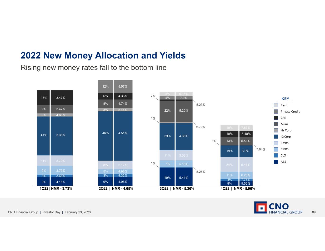 CNO Financial Group | Investor Day | February 23, 2023 89 KEY Resi Private Credit CRE Muni HY Corp IG Corp RMBS CMBS CLO ABS 1Q22 | NMR - 3.73% 2Q22 | NMR - 4.65% 3Q22 | NMR - 5.36% 4Q22 | NMR - 5.96% Rising new money rates fall to the bottom line 2022 New Money Allocation and Yields 9% 3% 9% 11% 41% 3% 9% 15% 9% 5% 46% 8% 6% 3% 8% 3% 12% 19% 7% 29% 4% 1% 11% 22% 1% 2% 4% 8% 24% 13% 11% 4% 19% 1% 10% 10% 4.16% 3.68% 3.79% 3.70% 3.35% 4.63% 3.47% 3.47% 4.95% 4.98% 4.51% 4.74% 4.36% 4.32% 5.17% 5.44% 9.57% 5.41% 5.16% 4.35% 7.0% 5.53% 5.20% 6.16% 5.25% 6.70% 5.23% 5.55% 5.43% 5.58% 6.25% 7.77% 6.0% 5.40% 7.53% 7.04%