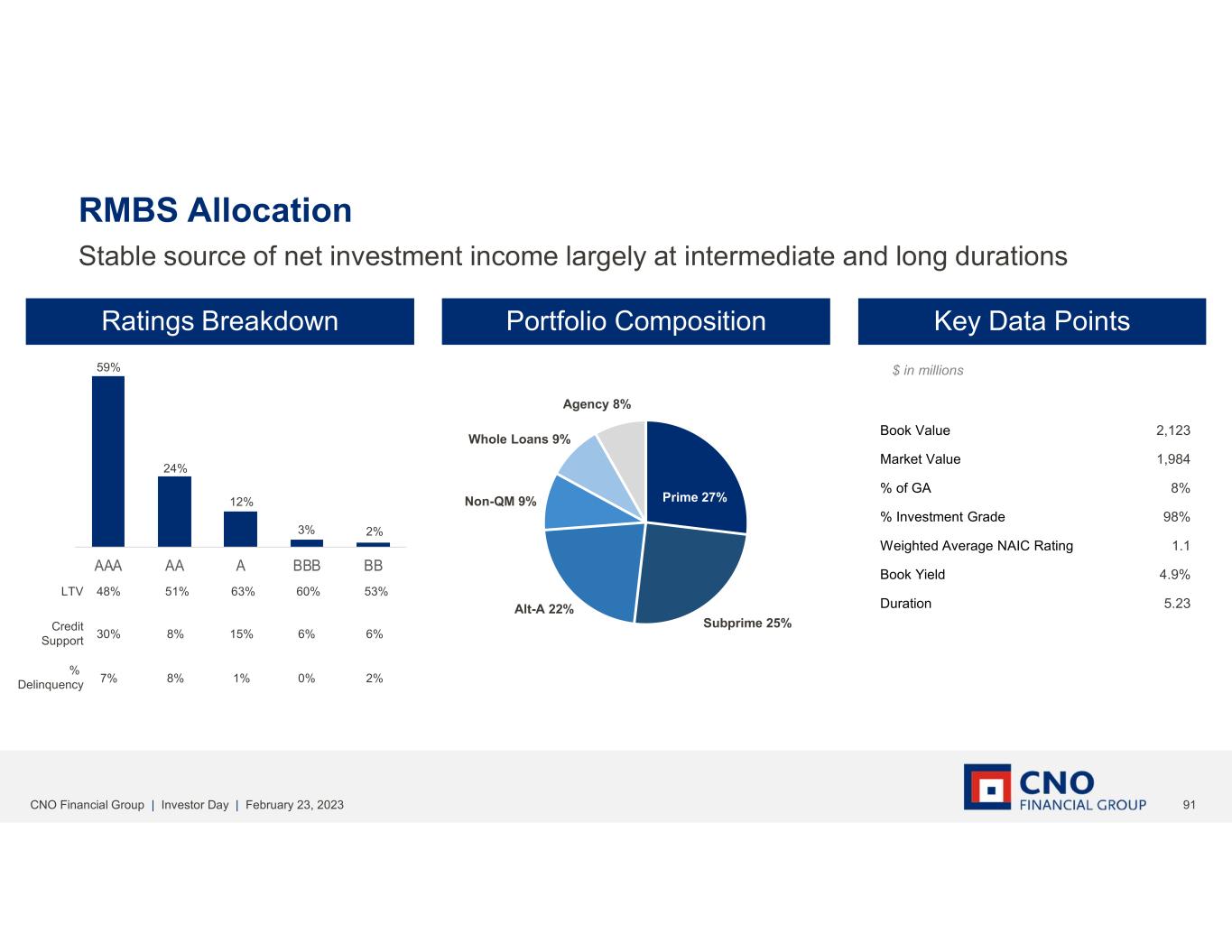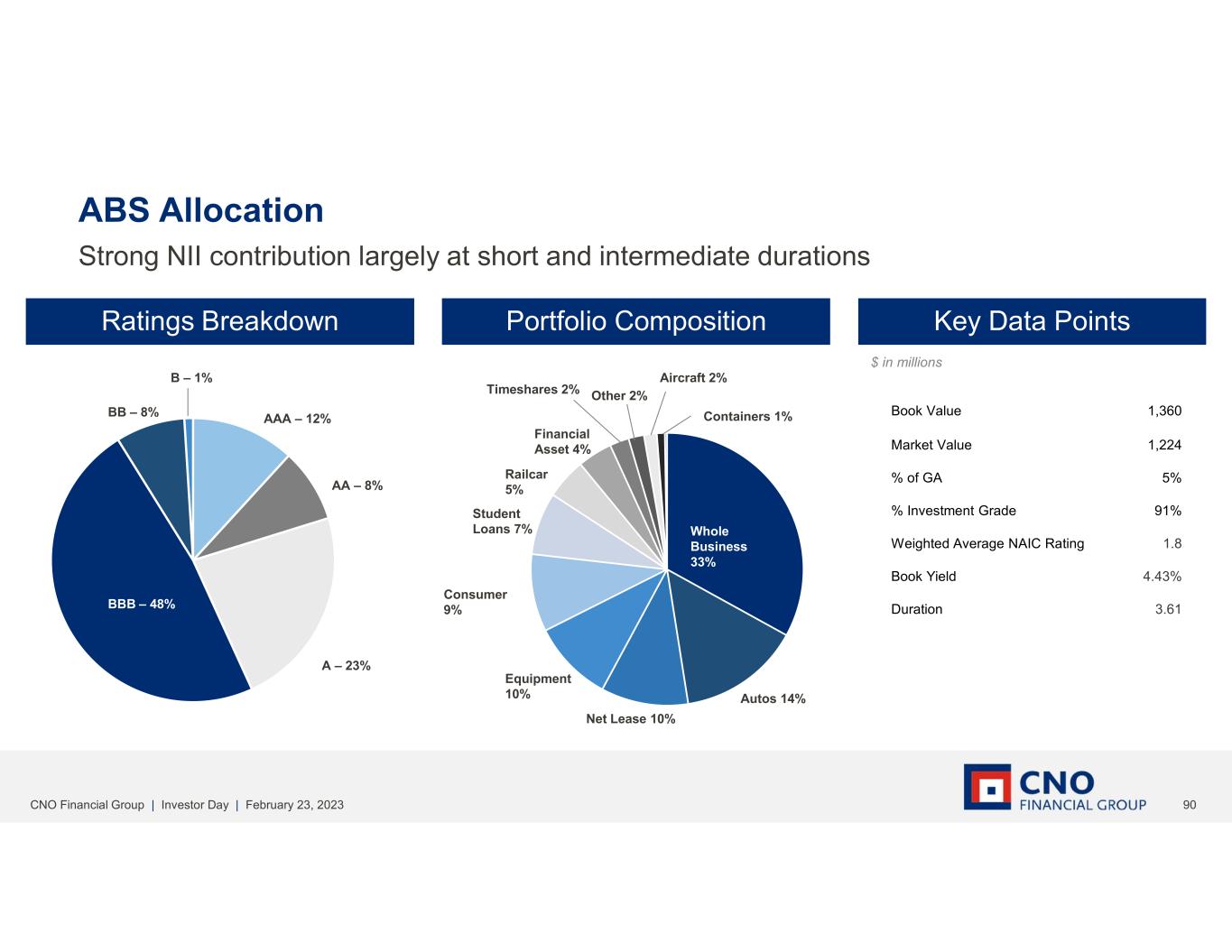 CNO Financial Group | Investor Day | February 23, 2023 90 Strong NII contribution largely at short and intermediate durations ABS Allocation Ratings Breakdown Key Data Points $ in millions 3Q22 Whole Business 33% Book Value 1,360 Market Value 1,224 % of GA 5% % Investment Grade 91% Weighted Average NAIC Rating 1.8 Book Yield 4.43% Duration 3.61 Whole Business 33% Autos 14% Net Lease 10% Equipment 10% Consumer 9% Student Loans 7% Railcar 5% Financial Asset 4% Timeshares 2% Other 2% Aircraft 2% Containers 1% A – 23% AA – 8% AAA – 12% B – 1% BB – 8% BBB – 48% Portfolio Composition