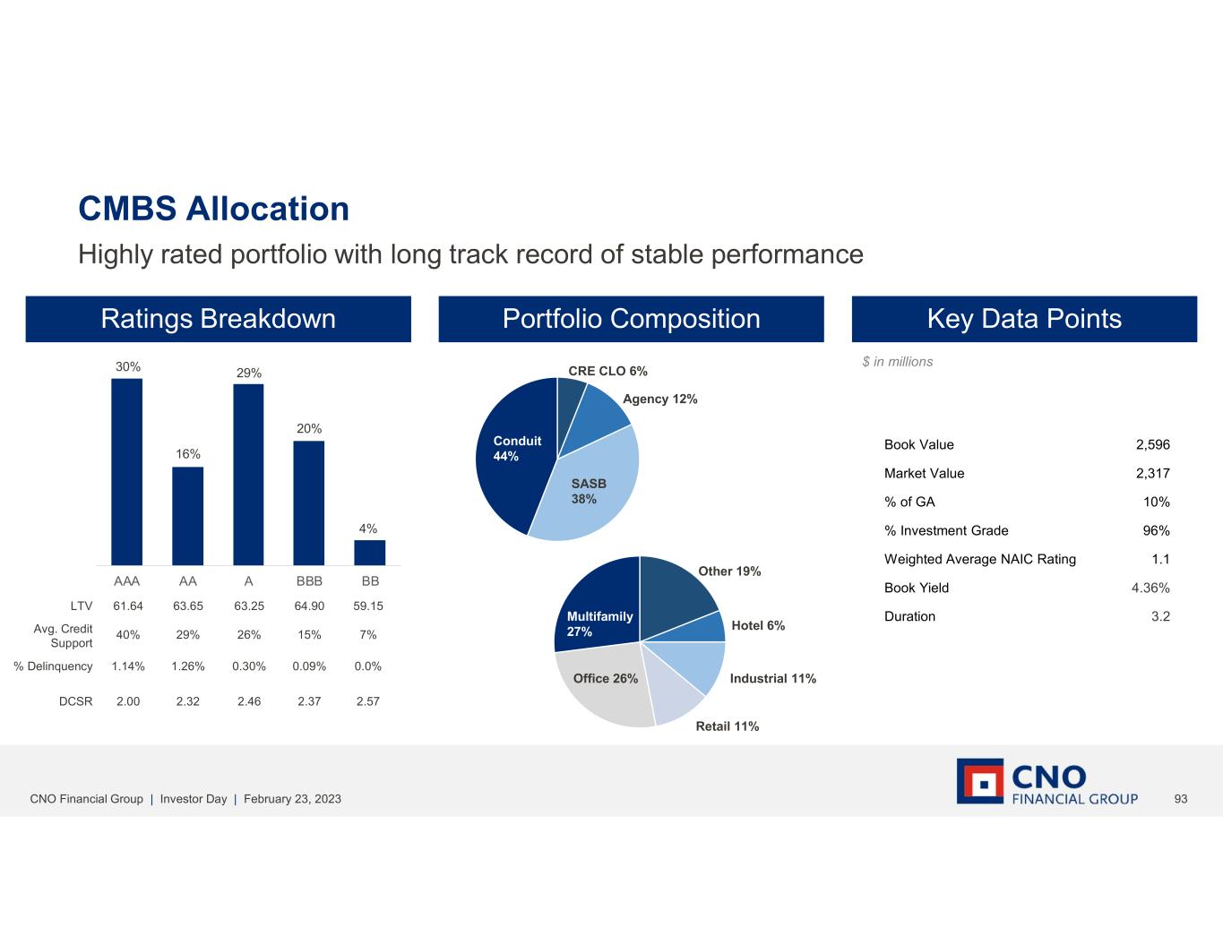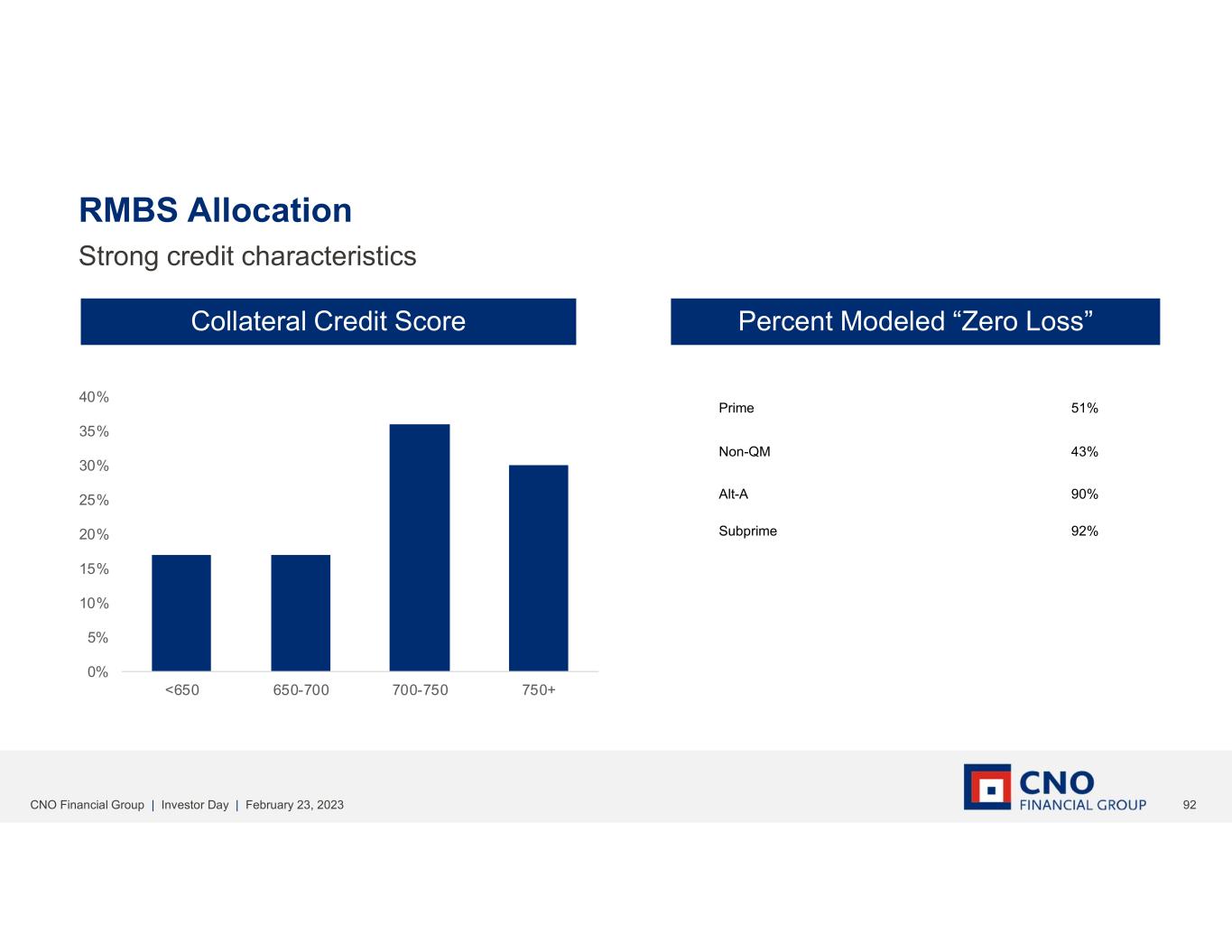 CNO Financial Group | Investor Day | February 23, 2023 91 Stable source of net investment income largely at intermediate and long durations RMBS Allocation $ in millions 3Q22 Prime 27% Book Value 2,123 Market Value 1,984 % of GA 8% % Investment Grade 98% Weighted Average NAIC Rating 1.1 Book Yield 4.9% Duration 5.23 Credit Support AAA AA A BBB BB 30% 8% 15% 6% 6% Agency 8% Whole Loans 9% Non-QM 9% Alt-A 22% Subprime 25% 59% 24% 12% 3% 2% % Delinquency 7% 8% 1% 0% 2% LTV 48% 51% 63% 60% 53% Ratings Breakdown Key Data PointsPortfolio Composition