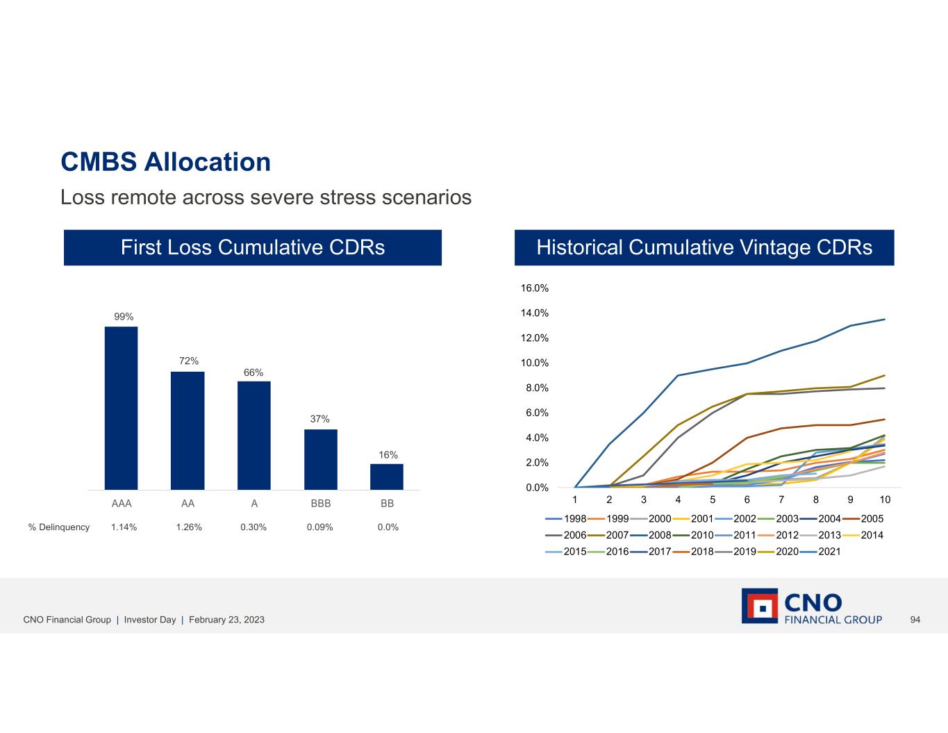CNO Financial Group | Investor Day | February 23, 2023 93 Highly rated portfolio with long track record of stable performance CMBS Allocation $ in millions Book Value 2,596 Market Value 2,317 % of GA 10% % Investment Grade 96% Weighted Average NAIC Rating 1.1 Book Yield 4.36% Duration 3.2 CRE CLO 6% Conduit 44% SASB 38% Agency 12% Multifamily 27% Other 19% Hotel 6% Industrial 11% Retail 11% Office 26% AAA AA A BBB BB 30% 16% 29% 20% 4% Avg. Credit Support % Delinquency 1.14% 1.26% 0.30% 0.09% 0.0% 40% 29% 26% 15% 7% LTV DCSR 61.64 63.65 63.25 64.90 59.15 2.00 2.32 2.46 2.37 2.57 Ratings Breakdown Key Data PointsPortfolio Composition