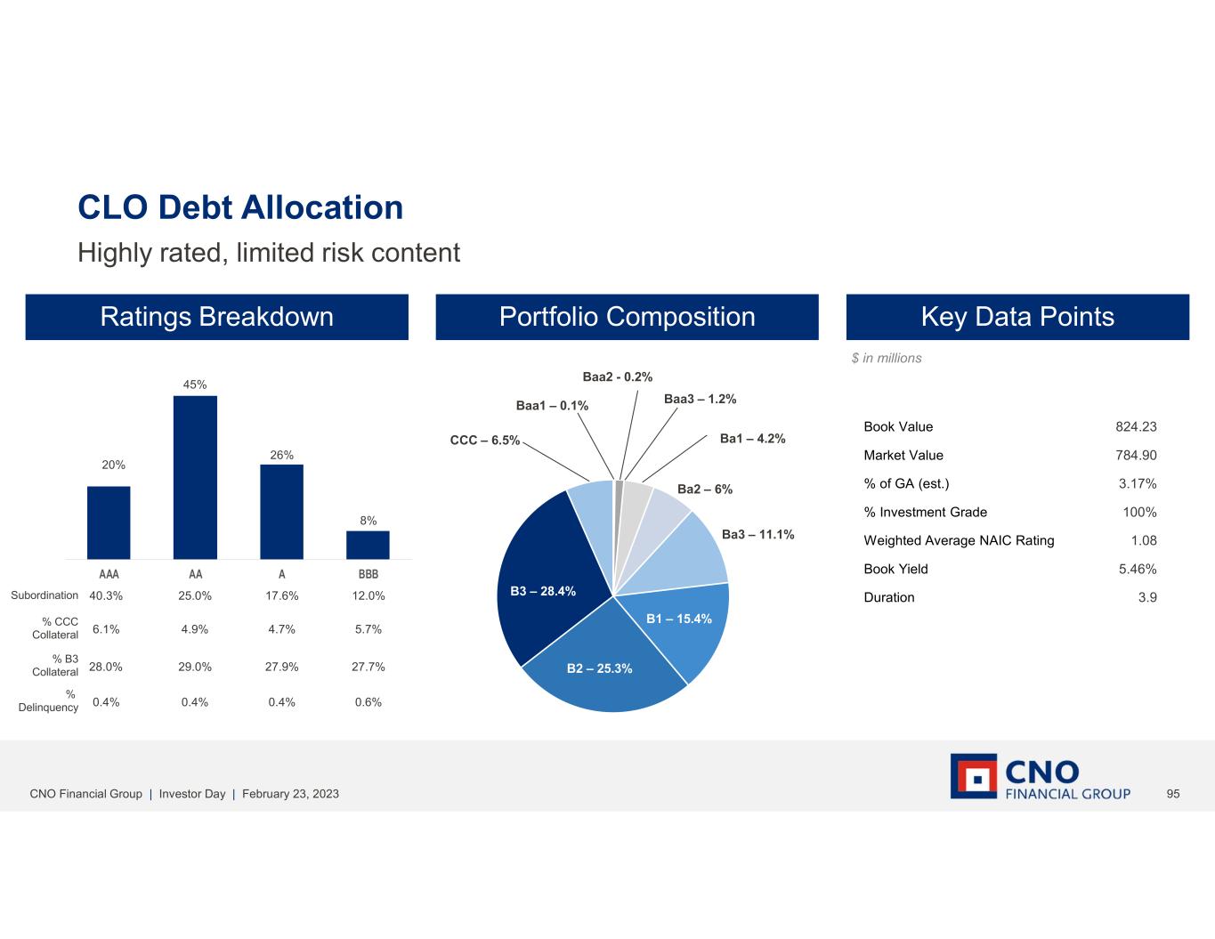 CNO Financial Group | Investor Day | February 23, 2023 94 AAA AA A BBB BB Loss remote across severe stress scenarios CMBS Allocation 99% 72% 66% 37% 16% % Delinquency 1.14% 1.26% 0.30% 0.09% 0.0% 0.0% 2.0% 4.0% 6.0% 8.0% 10.0% 12.0% 14.0% 16.0% 1 2 3 4 5 6 7 8 9 10 1998 1999 2000 2001 2002 2003 2004 2005 2006 2007 2008 2010 2011 2012 2013 2014 2015 2016 2017 2018 2019 2020 2021 Historical Cumulative Vintage CDRsFirst Loss Cumulative CDRs
