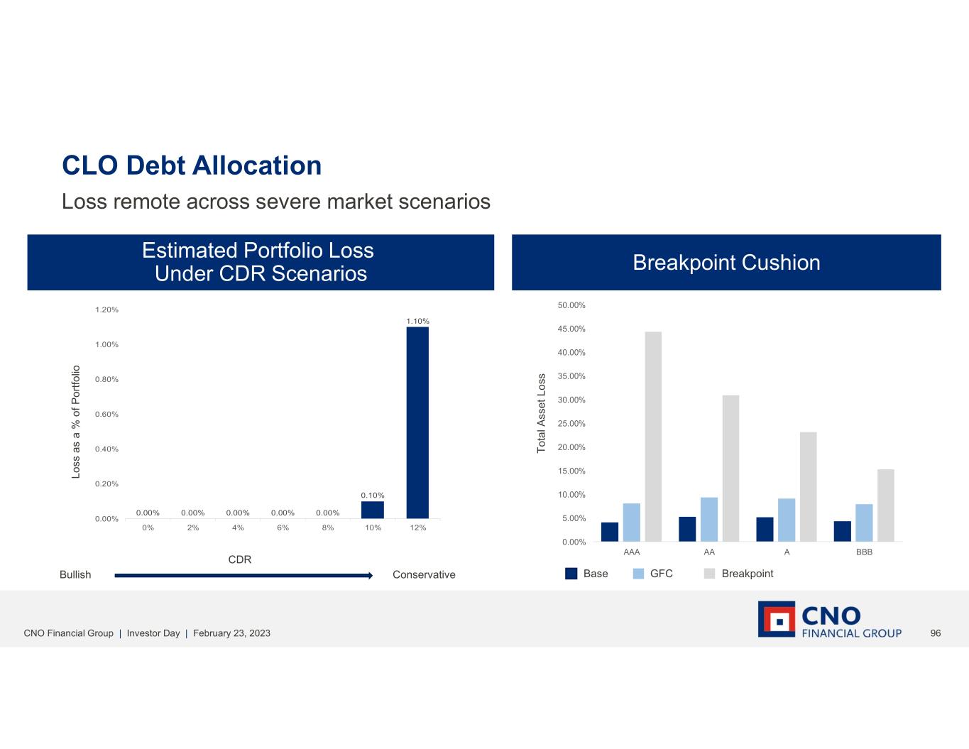 CNO Financial Group | Investor Day | February 23, 2023 95 Book Value 824.23 Market Value 784.90 % of GA (est.) 3.17% % Investment Grade 100% Weighted Average NAIC Rating 1.08 Book Yield 5.46% Duration 3.9 27.7% Highly rated, limited risk content CLO Debt Allocation $ in millions Subordination % Delinquency % CCC Collateral % B3 Collateral AAA AA A BBB 40.3% 25.0% 17.6% 12.0% 6.1% 4.9% 4.7% 5.7% 0.4% 0.4% 0.4% 0.6% 28.0% 29.0% 27.9% 20% 45% 26% 8% B3 – 28.4% B2 – 25.3% B1 – 15.4% Ba3 – 11.1% Ba2 – 6% Ba1 – 4.2% Baa3 – 1.2% Baa2 - 0.2% Baa1 – 0.1% CCC – 6.5% Ratings Breakdown Key Data PointsPortfolio Composition