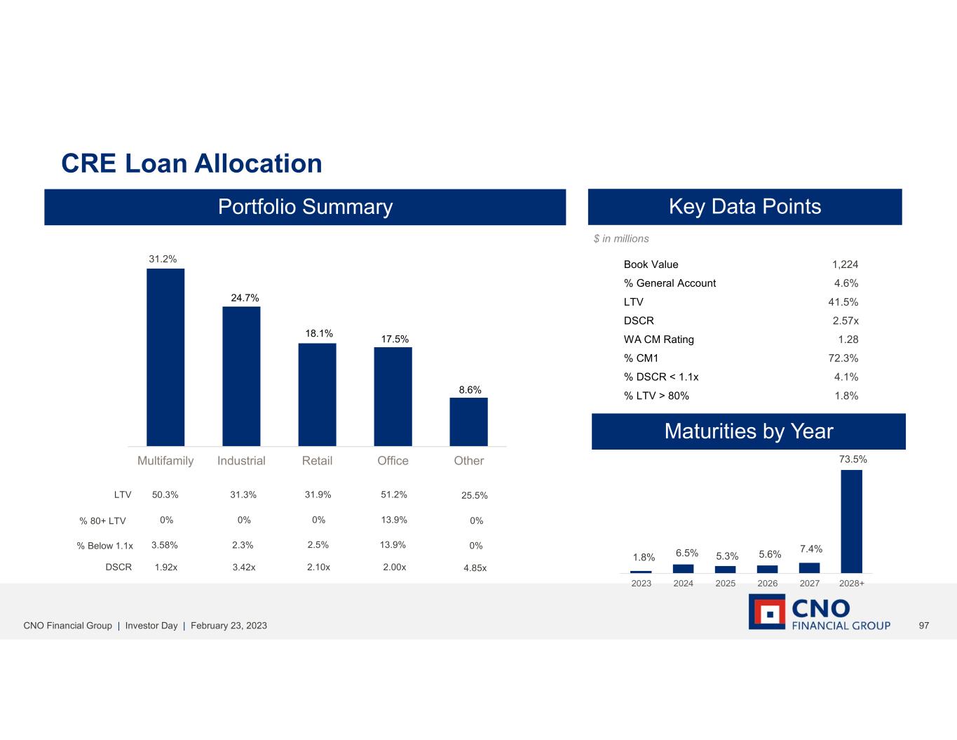 CNO Financial Group | Investor Day | February 23, 2023 97 2023 2024 2025 2026 2027 2028+ No delinquent or restructured loans CRE Loan Allocation LTV X% X% X% X% DSCR % 80+ LTV % Below 1.1x Book Value 1,224 % General Account 4.6% LTV 41.5% DSCR 2.57x WA CM Rating 1.28 % CM1 72.3% % DSCR < 1.1x 4.1% % LTV > 80% 1.8% Key Data Points $ in millions Multifamily Industrial Retail Office Other 31.2% 24.7% 18.1% 17.5% 8.6% LTV 50.3% 31.3% 31.9% 51.2% 25.5% 0% 0% 0% 13.9% 0% 1.92x 3.42x 2.10x 2.00x 4.85x 3.58% 2.3% 2.5% 13.9% 0% Maturities by Year 1.8% 6.5% 5.3% 5.6% 7.4% 73.5% Portfolio Summary