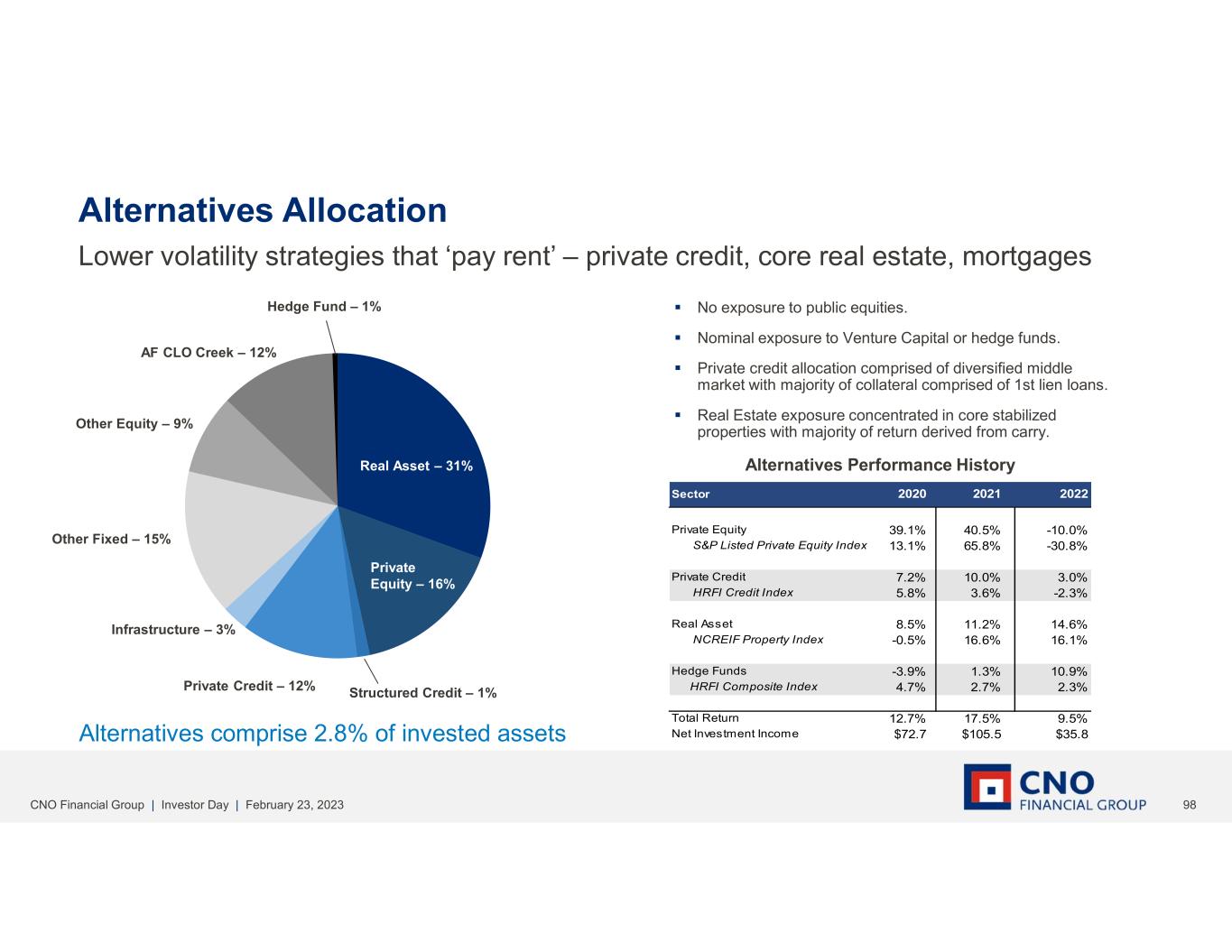 CNO Financial Group | Investor Day | February 23, 2023 98 Lower volatility strategies that ‘pay rent’ – private credit, core real estate, mortgages Alternatives Allocation  No exposure to public equities.  Nominal exposure to Venture Capital or hedge funds.  Private credit allocation comprised of diversified middle market with majority of collateral comprised of 1st lien loans.  Real Estate exposure concentrated in core stabilized properties with majority of return derived from carry. Alternatives Performance History Sector 2020 2021 2022 Private Equity 39.1% 40.5% -10.0% S&P Listed Private Equity Index 13.1% 65.8% -30.8% Private Credit 7.2% 10.0% 3.0% HRFI Credit Index 5.8% 3.6% -2.3% Real Asset 8.5% 11.2% 14.6% NCREIF Property Index -0.5% 16.6% 16.1% Hedge Funds -3.9% 1.3% 10.9% HRFI Composite Index 4.7% 2.7% 2.3% Total Return 12.7% 17.5% 9.5% Net Investment Income $72.7 $105.5 $35.8Alternatives comprise 2.8% of invested assets Real Asset – 31% Private Equity – 16% Structured Credit – 1%Private Credit – 12% Infrastructure – 3% Other Fixed – 15% Other Equity – 9% AF CLO Creek – 12% Hedge Fund – 1%