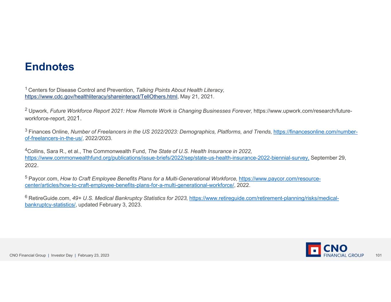 CNO Financial Group | Investor Day | February 23, 2023 101 Endnotes 1 Centers for Disease Control and Prevention, Talking Points About Health Literacy, https://www.cdc.gov/healthliteracy/shareinteract/TellOthers.html, May 21, 2021. 2 Upwork, Future Workforce Report 2021: How Remote Work is Changing Businesses Forever, https://www.upwork.com/research/future- workforce-report, 2021. 3 Finances Online, Number of Freelancers in the US 2022/2023: Demographics, Platforms, and Trends, https://financesonline.com/number- of-freelancers-in-the-us/, 2022/2023. 4Collins, Sara R., et al., The Commonwealth Fund, The State of U.S. Health Insurance in 2022, https://www.commonwealthfund.org/publications/issue-briefs/2022/sep/state-us-health-insurance-2022-biennial-survey, September 29, 2022. 5 Paycor.com, How to Craft Employee Benefits Plans for a Multi-Generational Workforce, https://www.paycor.com/resource- center/articles/how-to-craft-employee-benefits-plans-for-a-multi-generational-workforce/, 2022. 6 RetireGuide.com, 49+ U.S. Medical Bankruptcy Statistics for 2023, https://www.retireguide.com/retirement-planning/risks/medical- bankruptcy-statistics/, updated February 3, 2023.