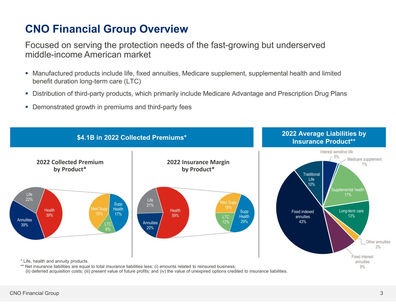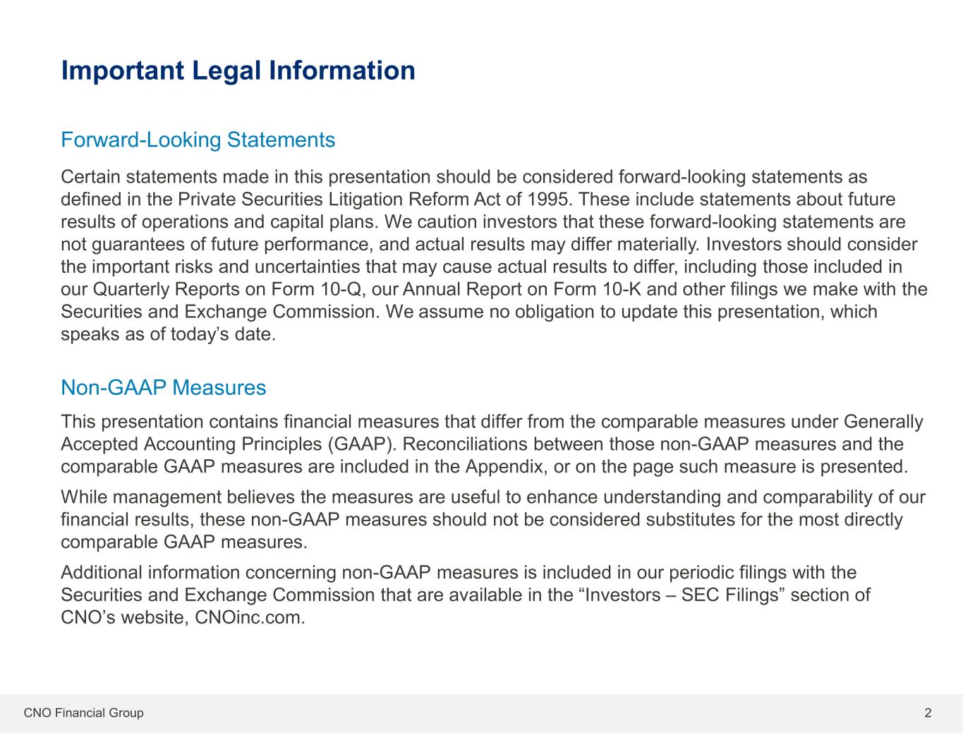 CNO Financial Group 2 Important Legal Information Certain statements made in this presentation should be considered forward-looking statements as defined in the Private Securities Litigation Reform Act of 1995. These include statements about future results of operations and capital plans. We caution investors that these forward-looking statements are not guarantees of future performance, and actual results may differ materially. Investors should consider the important risks and uncertainties that may cause actual results to differ, including those included in our Quarterly Reports on Form 10-Q, our Annual Report on Form 10-K and other filings we make with the Securities and Exchange Commission. We assume no obligation to update this presentation, which speaks as of today’s date. This presentation contains financial measures that differ from the comparable measures under Generally Accepted Accounting Principles (GAAP). Reconciliations between those non-GAAP measures and the comparable GAAP measures are included in the Appendix, or on the page such measure is presented. While management believes the measures are useful to enhance understanding and comparability of our financial results, these non-GAAP measures should not be considered substitutes for the most directly comparable GAAP measures. Additional information concerning non-GAAP measures is included in our periodic filings with the Securities and Exchange Commission that are available in the “Investors – SEC Filings” section of CNO’s website, CNOinc.com. Non-GAAP Measures Forward-Looking Statements