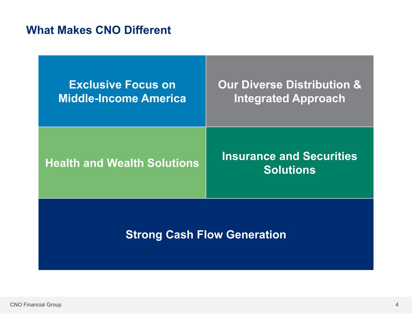 CNO Financial Group 3 Focused on serving the protection needs of the fast-growing but underserved middle-income American market CNO Financial Group Overview  Manufactured products include life, fixed annuities, Medicare supplement, supplemental health and limited benefit duration long-term care (LTC)  Distribution of third-party products, which primarily include Medicare Advantage and Prescription Drug Plans  Demonstrated growth in premiums and third-party fees 2022 Average Liabilities by Insurance Product** $4.1B in 2022 Collected Premiums* 2022 Collected Premium by Product* 2022 Insurance Margin by Product* Annuities 20% Life 21% LTC 12% Med Supp 18% Supp Health 29% Health 59% Annuities 39% Life 22% LTC 6% Med Supp 16% Supp Health 17% Health 39% * Life, health and annuity products. ** Net insurance liabilities are equal to total insurance liabilities less: (i) amounts related to reinsured business; (ii) deferred acquisition costs; (iii) present value of future profits; and (iv) the value of unexpired options credited to insurance liabilities. Interest sensitive life 5% Medicare supplement 1% Supplemental health 17% Long-term care 13% Other annuities 2% Fixed interest annuities 9% Fixed indexed annuities 43% Traditional Life 10%