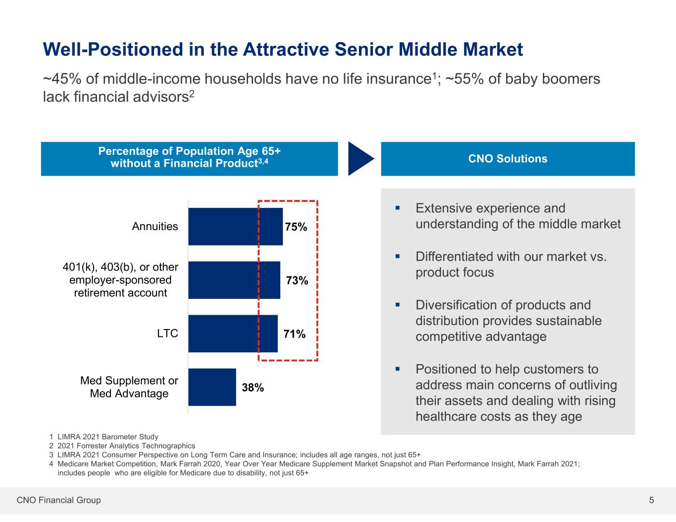CNO Financial Group 4 What Makes CNO Different Exclusive Focus on Middle-Income America Our Diverse Distribution & Integrated Approach Health and Wealth Solutions Insurance and Securities Solutions Strong Cash Flow Generation